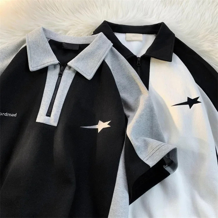 POLO男Vintage Men's Polo Shirt Short Sleeves Loose Fit Color Block Top Trendy Summer Casual Couple Shirt Harajuku Style