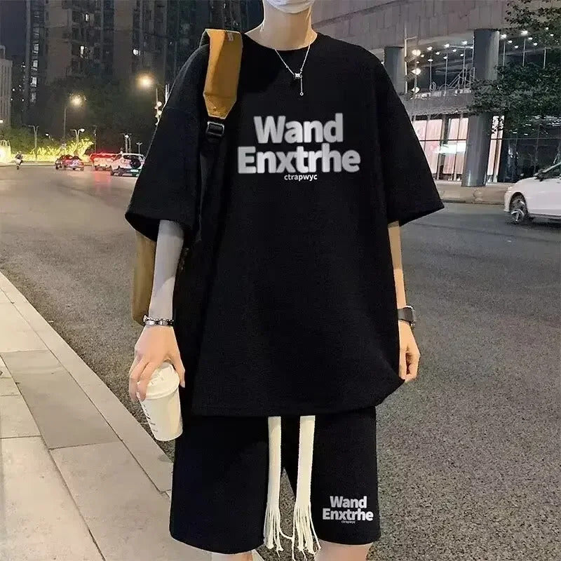 男士套装Summer New Set Cool Youth Shorts Short Sleeves Suit Men's Loose-fit Wide Version Initial High School Summer Wear