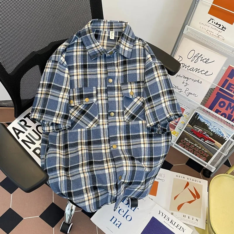 衬衫男Men's American Style Vintage Street Multi-Pocket Work Plaid Shirt Women's Summer Trendy Brand Blue Grid Pattern Casual Shirt