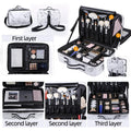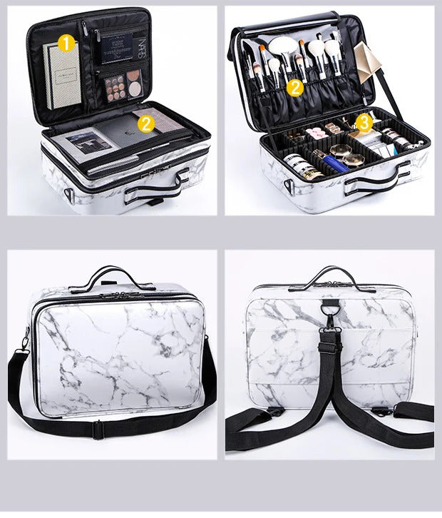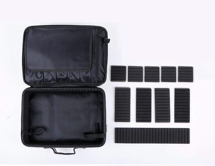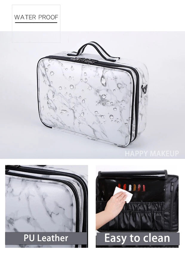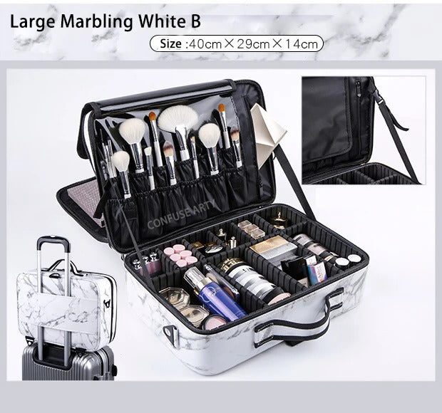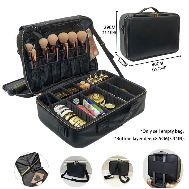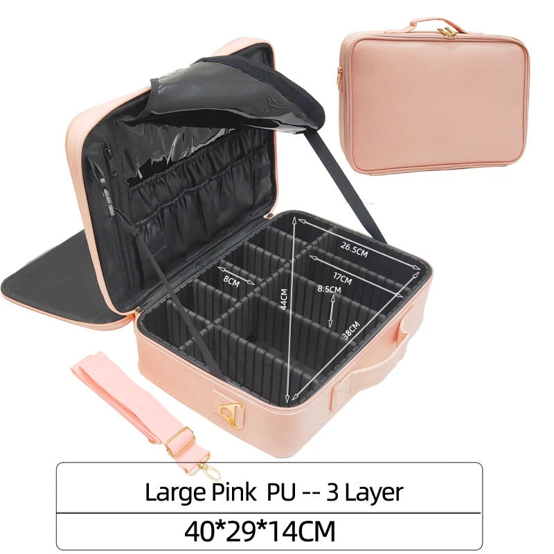 Easy to carry. Top Handle, detachable & adjustable shoulder strap make it easy to carry around. Back design can fasten the makeup case to the draw bar of your rolling suitcases, perfect for both daily and traveling use.