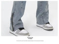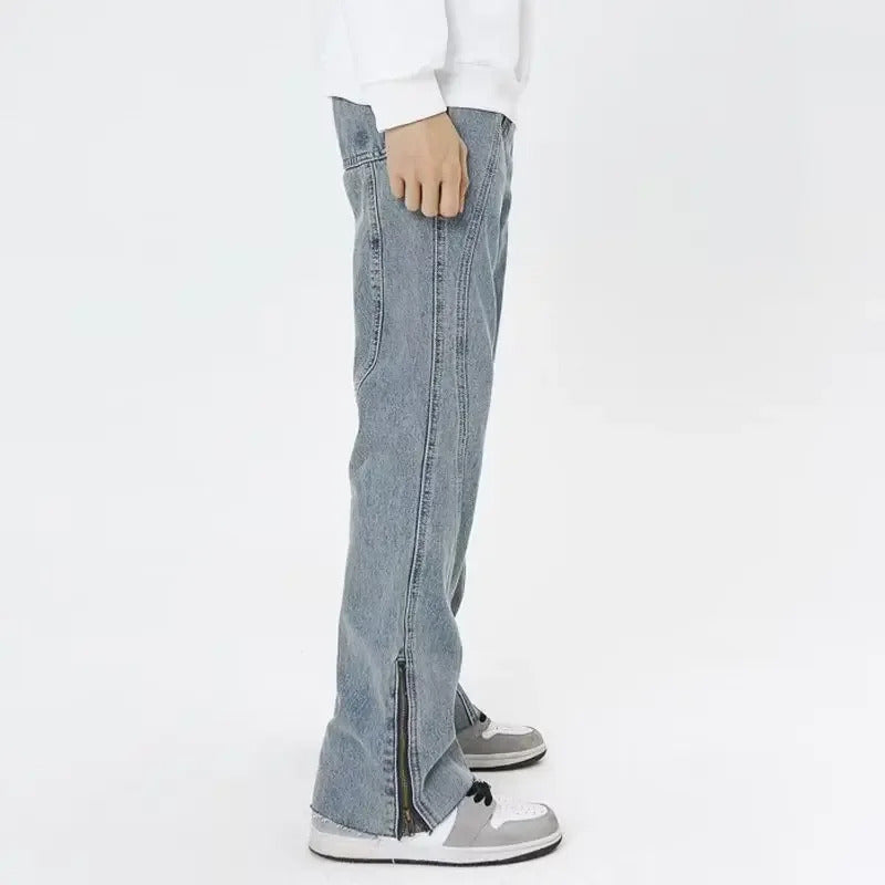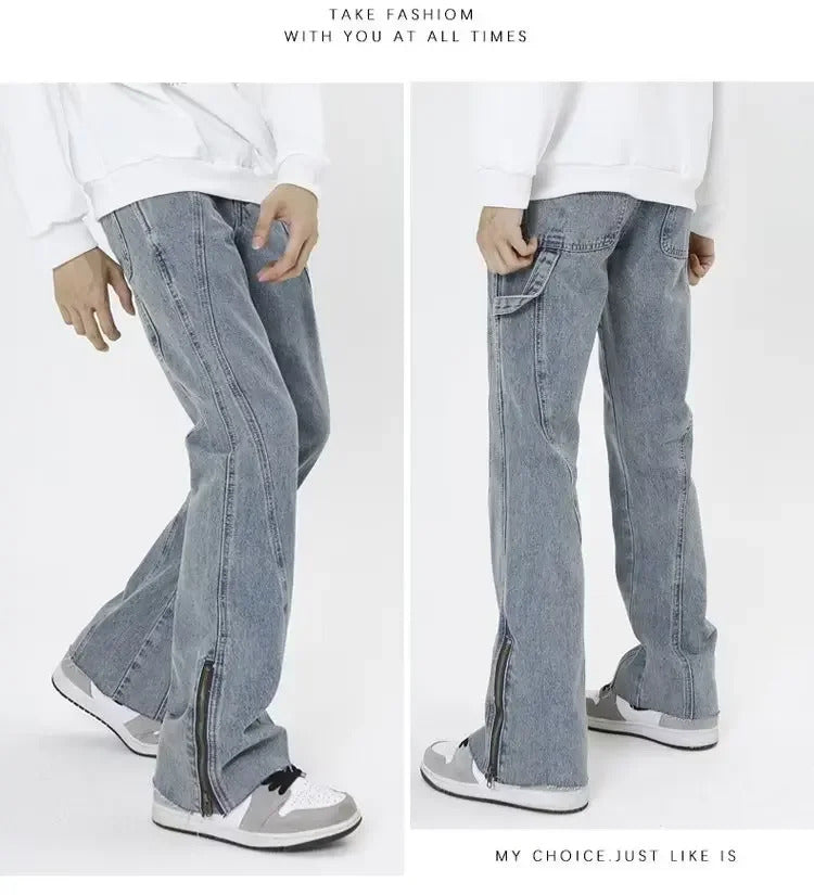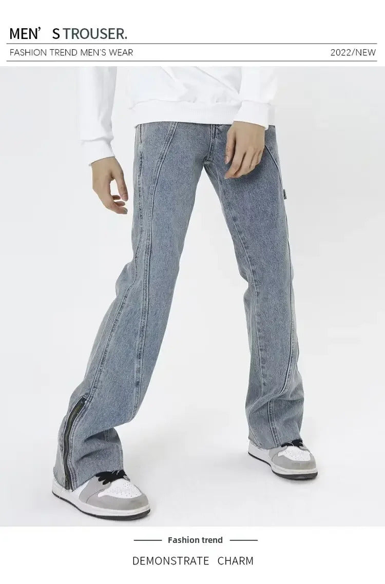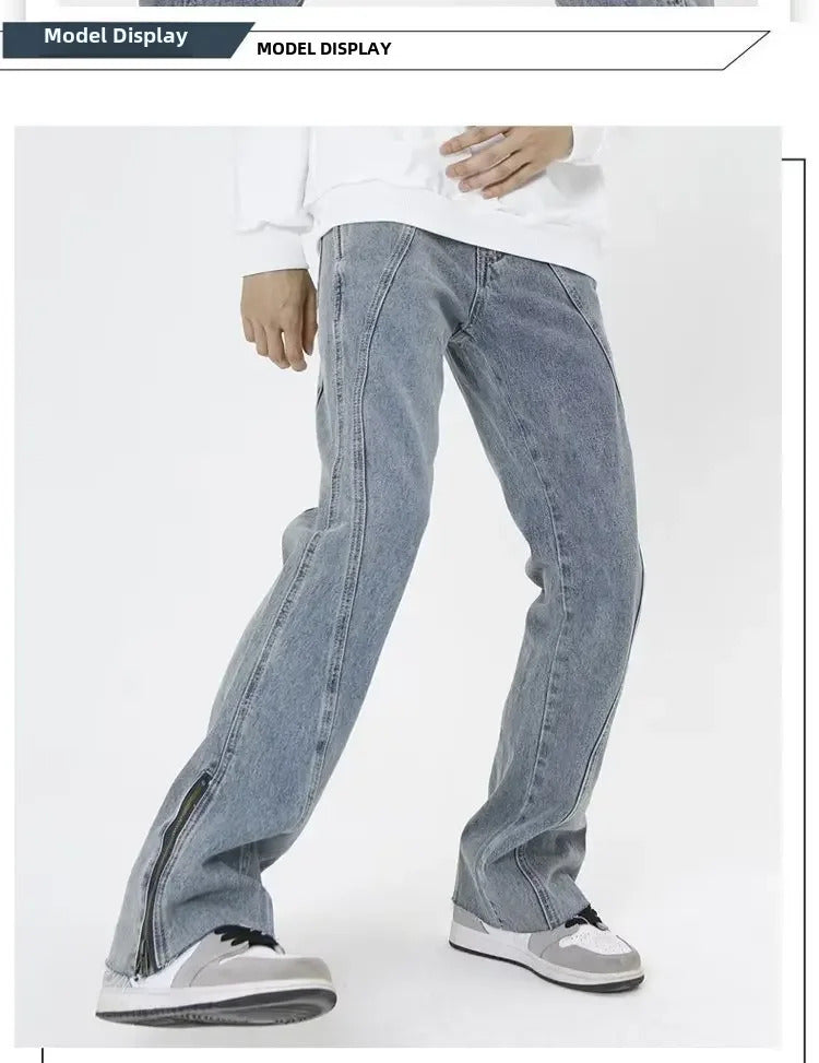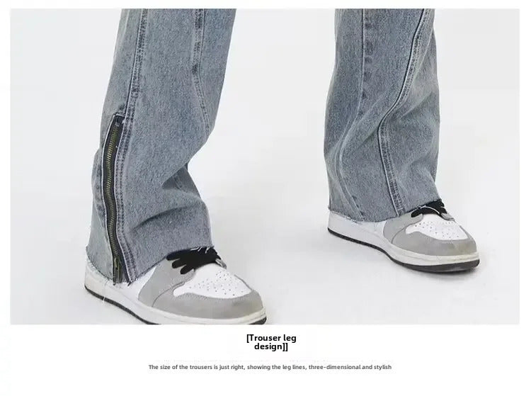 牛仔裤男American Style High Street Vibe Zippered Side Slit Men's Jeans Loose Fit Straight Leg Micro Flared Trousers Trendy Brand