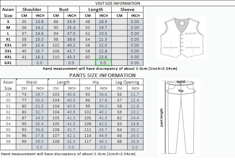 Specifications:Material: Polyester, Acetate, ViscoseGender: MenFit Type: Slim StraightClothing Length: RegularPant Closure Type: Zipper FlyClosure Type: Single BreastedFeatures:**Elegant Craftsmanship and Versatile Style**The Boutique S-5XL (suit + vest + trousers) Slim Business Elite Party Evening Dress Groomsmen British Style Men's Three-Piece Suit is a testament to sophisticated tailoring and timeless design. Crafted from a blend of premium polyester, acetate, and viscose, this suit offers a luxurious feel and a wrinkle-resistant finish, ensuring you look sharp from dawn to dusk. The slim straight fit is designed to accentuate your physique, while the regular clothing length provides a comfortable fit for a variety of body types. The single-breasted closure adds a touch of elegance, while the zipper fly offers a secure and adjustable fit for the trousers.**Versatile Occasions and Seasons**Whether you're attending a business meeting, a formal event, or a wedding, this suit is your go-to choice. Its versatile style makes it suitable for a range of occasions, from the honourable corps of gentleman at arm to the rocco gentleman clothing collection. The black men's church suit is a classic choice for religious ceremonies, while the vintage groom suit and cavour suit review highlight its ability to stand out in a crowd. The suit's four-season adaptability ensures you can wear it throughout the year, making it a valuable addition to any wardrobe.**Tailored for the Modern Gentleman**This suit is not just about style; it's about comfort and functionality. The straight fit and regular clothing length cater to a modern gentleman's preference for a sleek silhouette without compromising on comfort. The suit's lightweight fabric allows for ease of movement, making it perfect for long hours of business meetings or social gatherings. The inclusion of a vest and trousers in the set ensures you have a complete outfit ready to wear, making it a convenient choice for the busy man. Embrace the elegance and versatility of this Boutique S-5XL suit, and step out with confidence in any setting.