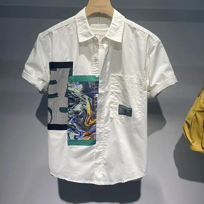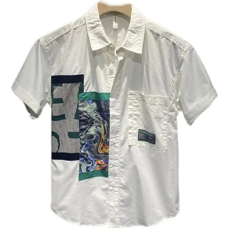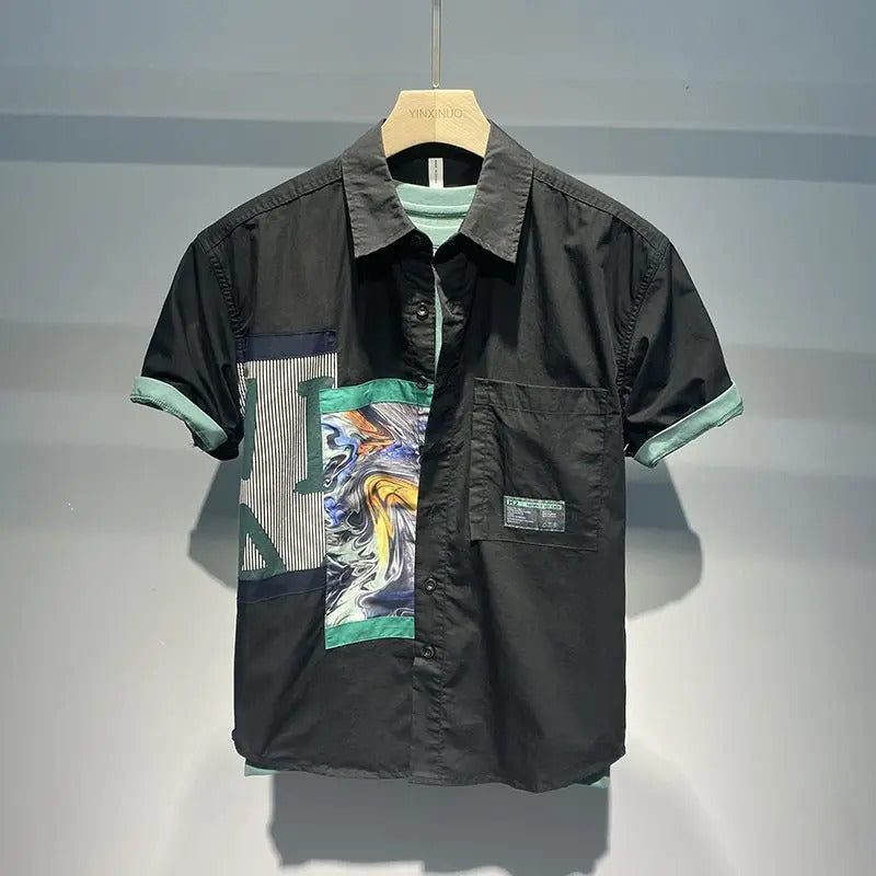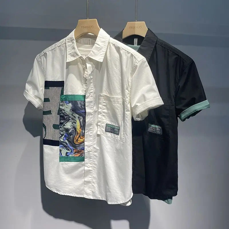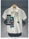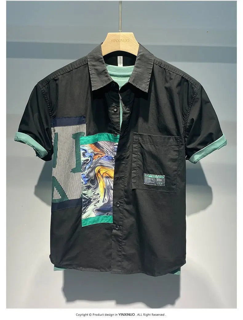 衬衫男Elegant Fashion Harajuku Slim Fit Ropa Hombre Loose Casual All Match Sport Shirt Printed Patchwork Button Short Sleeve Blusa