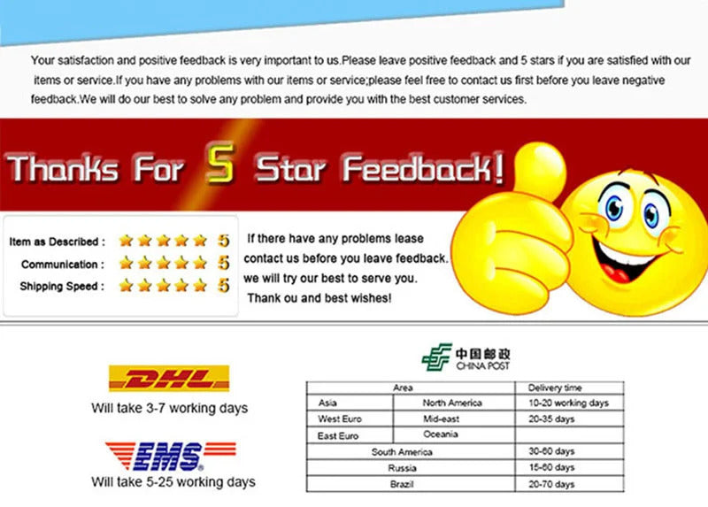 4. If you are our store's old customer,and gove us 5 stars and positive feedback in your previous order,when you place a new order in our store.you can send a message your new order number and your last order number to us .we will send you a gift or give you some extra discount.
