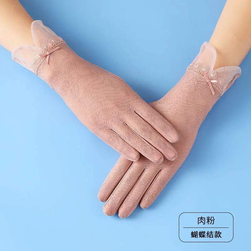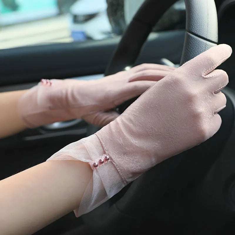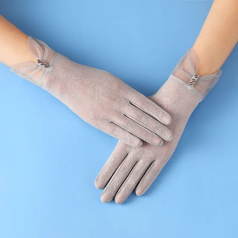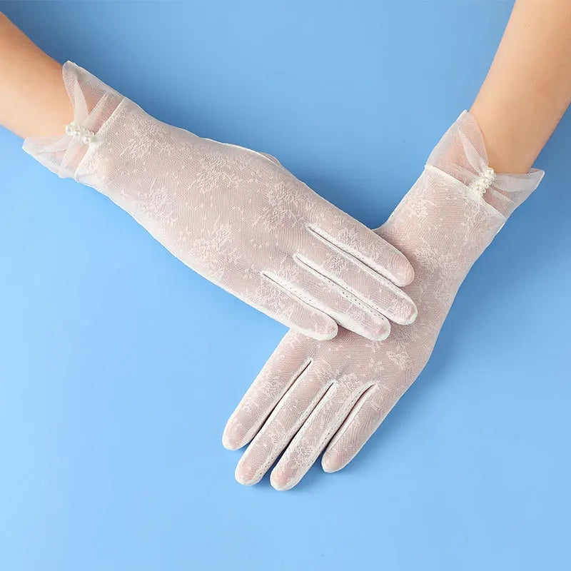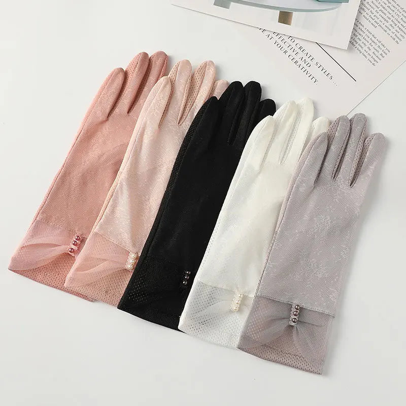 Lace Sunscreen Gloves Summer Women Sexy Ice Silk Non-Slip Touch Screen Breathable Thin Mid-Length Elegant Pearl Flower Bow TK31