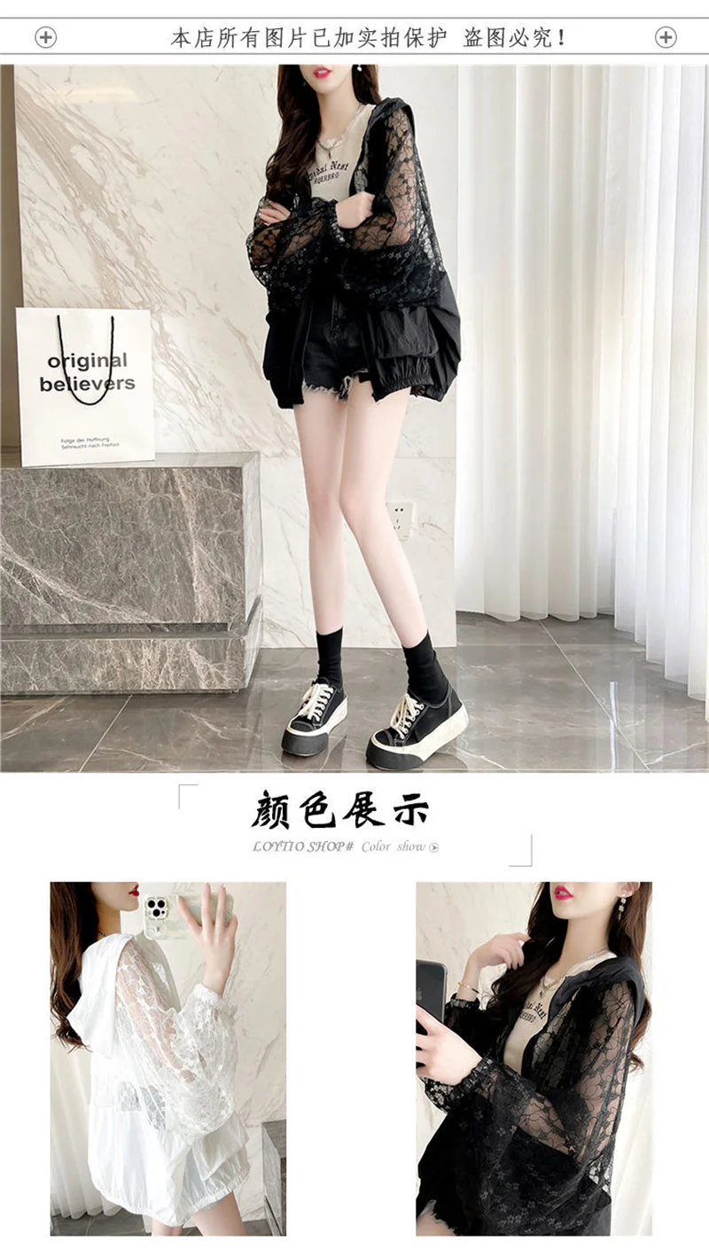 Specifications: Material: High-quality polyester Closure Type: Secure zipper Hooded: Yes, for added protection Pattern Type: Solid, versatile for any outfit Sleeve Length: Full, providing coverage and comfort Season: Perfect for summer, offering lightweight protection Features: |Women City Breeze Rain Jacket|White Windbreaker Women|Women Peas Coat Shorts| **Elegant Design and Versatility** The 2024 New Summer Fashion Sun Protection Clothing is a testament to the fusion of style and practicality. Designed with a Korean aesthetic, this jacket features a chic lace hollow-out splice that adds a touch of elegance to its casual silhouette. The hooded design ensures that you stay protected from the sun's rays, while the full sleeves provide coverage and comfort during cooler summer evenings. The solid pattern type makes it a versatile piece that can be effortlessly paired with various outfits, from casual jeans to more formal attire. **Comfort and Functionality** Crafted from premium polyester, this jacket offers a soft and comfortable feel against the skin. The lightweight material ensures that you stay cool and comfortable during the warmer summer months. The zipper closure provides a secure fit, while the convenient pockets offer a place to store your essentials. The turn-down collar adds a touch of sophistication, making it suitable for both casual outings and more formal occasions. **Tailored for the Modern Woman** This jacket is designed with the modern woman in mind, catering to the middle-aged demographic. The loose fit ensures that it can accommodate a variety of body types, making it an inclusive choice for all. Whether you're looking for a women's city breeze rain jacket, a women's windbreaker plus size, or the best sun protection for your body, this jacket is the perfect blend of style and function. It's not just a jacket; it's a statement of fashion and practicality for the modern woman.