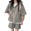 2 Pcs/Set Women Hoodie Shorts Set Half Zipper Hooded Three-quarter Sleeve Loose Big Pocket Top Elastic Waist Short Pants Set Thin Casual Sport Outfit