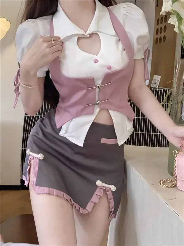?€? Three-piece Set :This three-piece sweet spice girl suit includes a white shirt, a pink dress, and a jacket, offering a complete look with minimal effort.