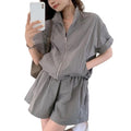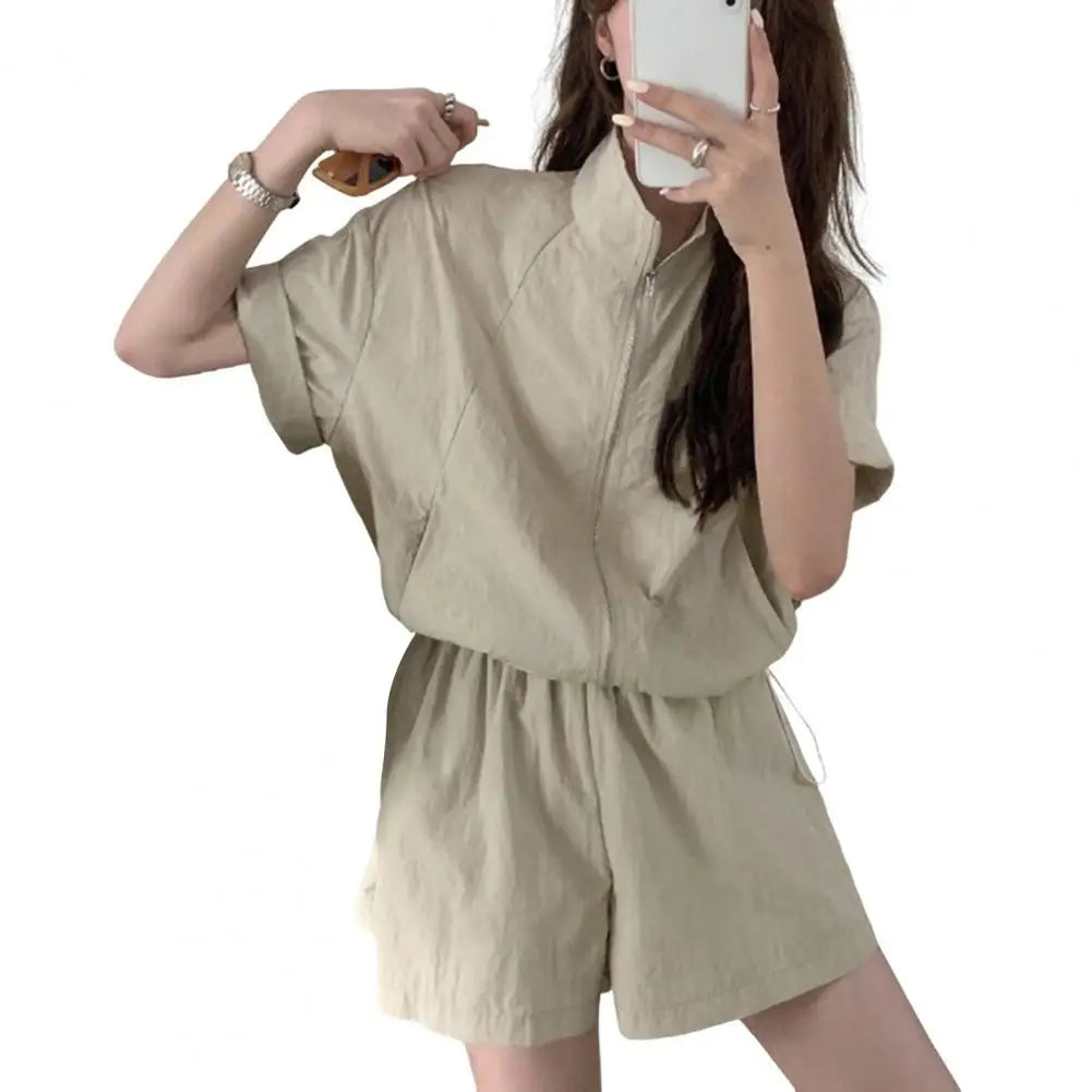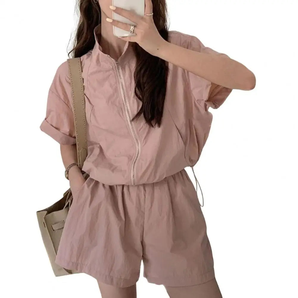 2 Pcs/Set Women Top Shorts Set Zipper Closure Short Sleeves Stand Collar Sunscreen Blouse Elastic High Waist Loose Pants Casual Sportwear Tracksuit