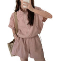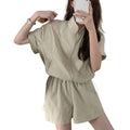 Elevate your style with this chic women's suit crafted from breathable polyester fiber. The stylish two-piece ensemble features a casual and loose design, ensuring comfort all day long. The solid color short-sleeved top pairs perfectly with the elastic waist shorts for a simple yet fashionable look.