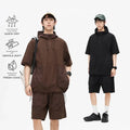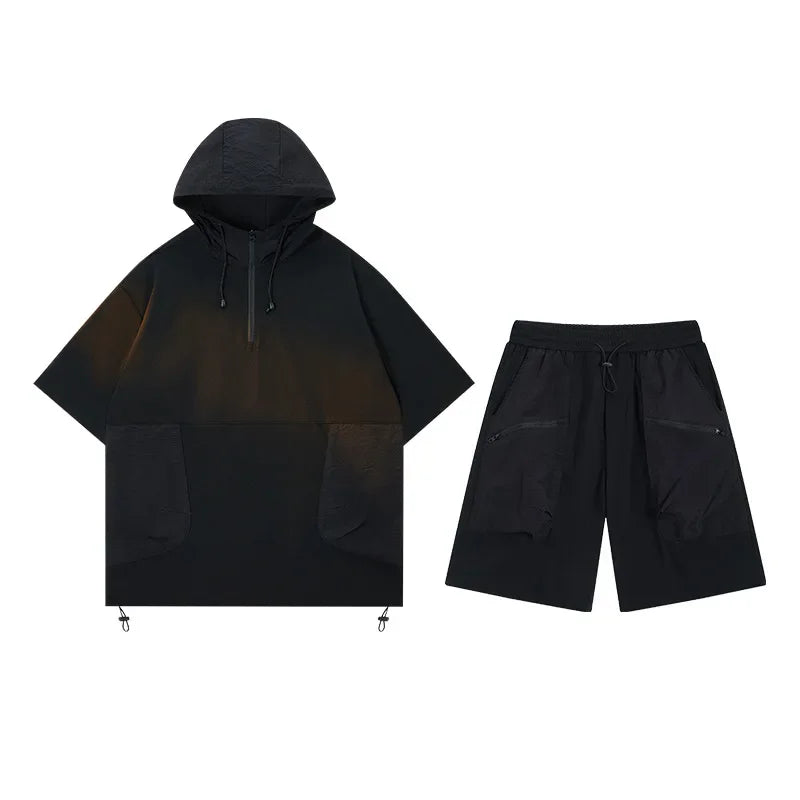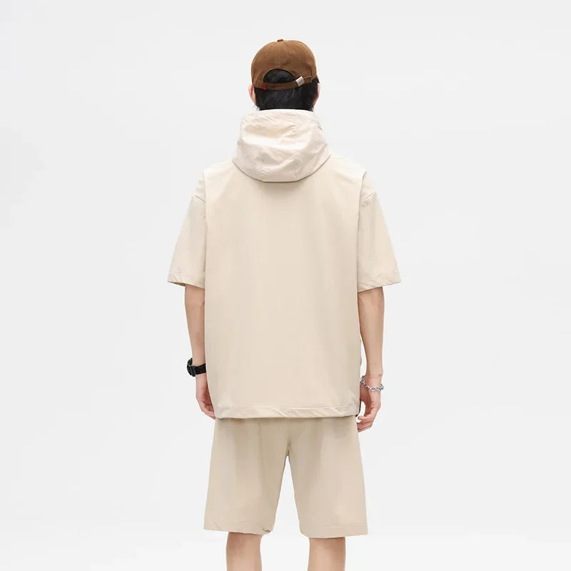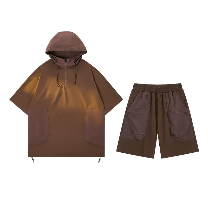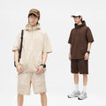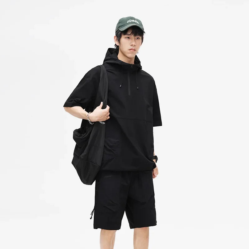 Japanese Style Vintage Half-Zipped Men's Summer Loose-Fit Casual Hooded T-Shirt Shorts 2-Piece Set Short Sleeves