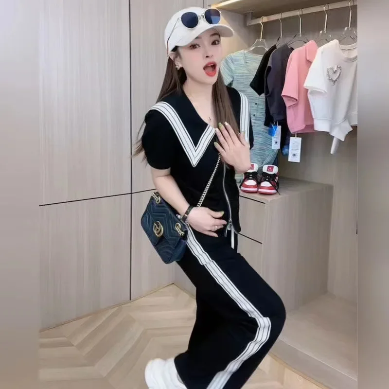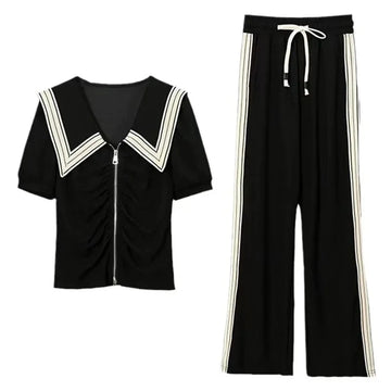 ?€? Fashionable Design : This navy collar fashion sports leisure suit boasts a trendy lapel design, perfect for summer trends.