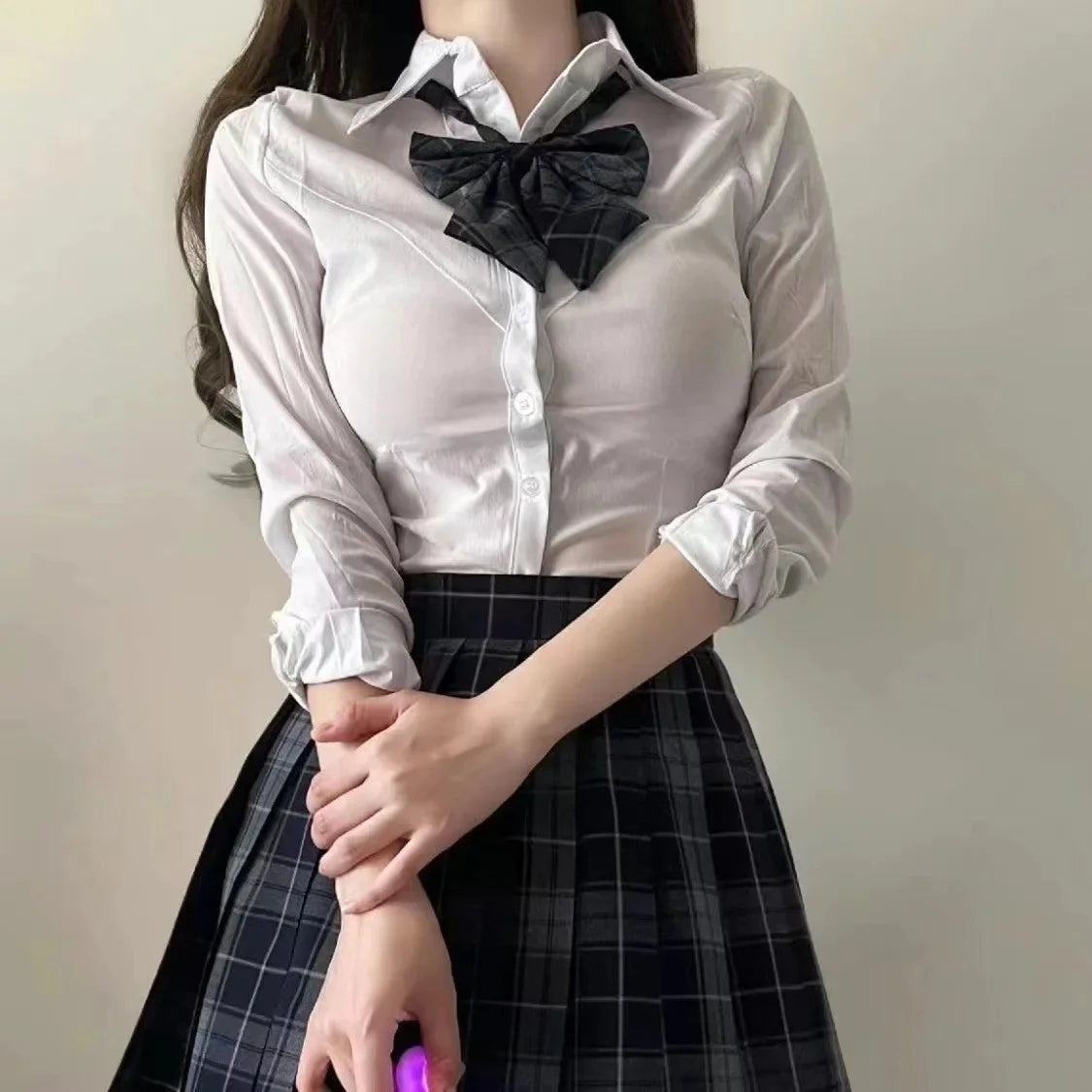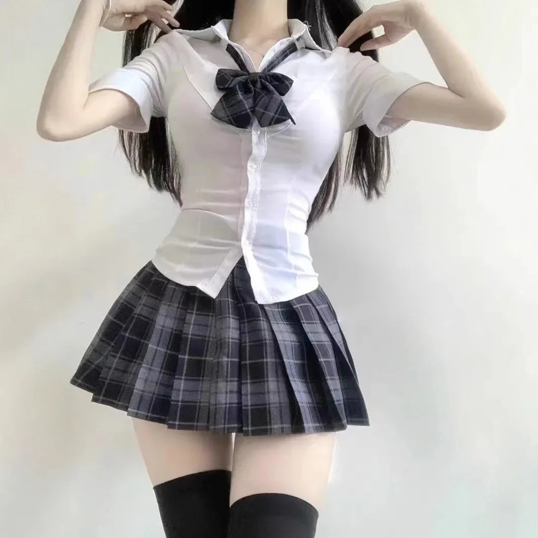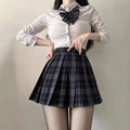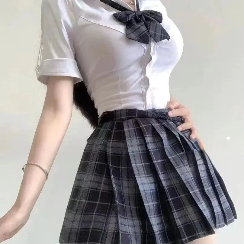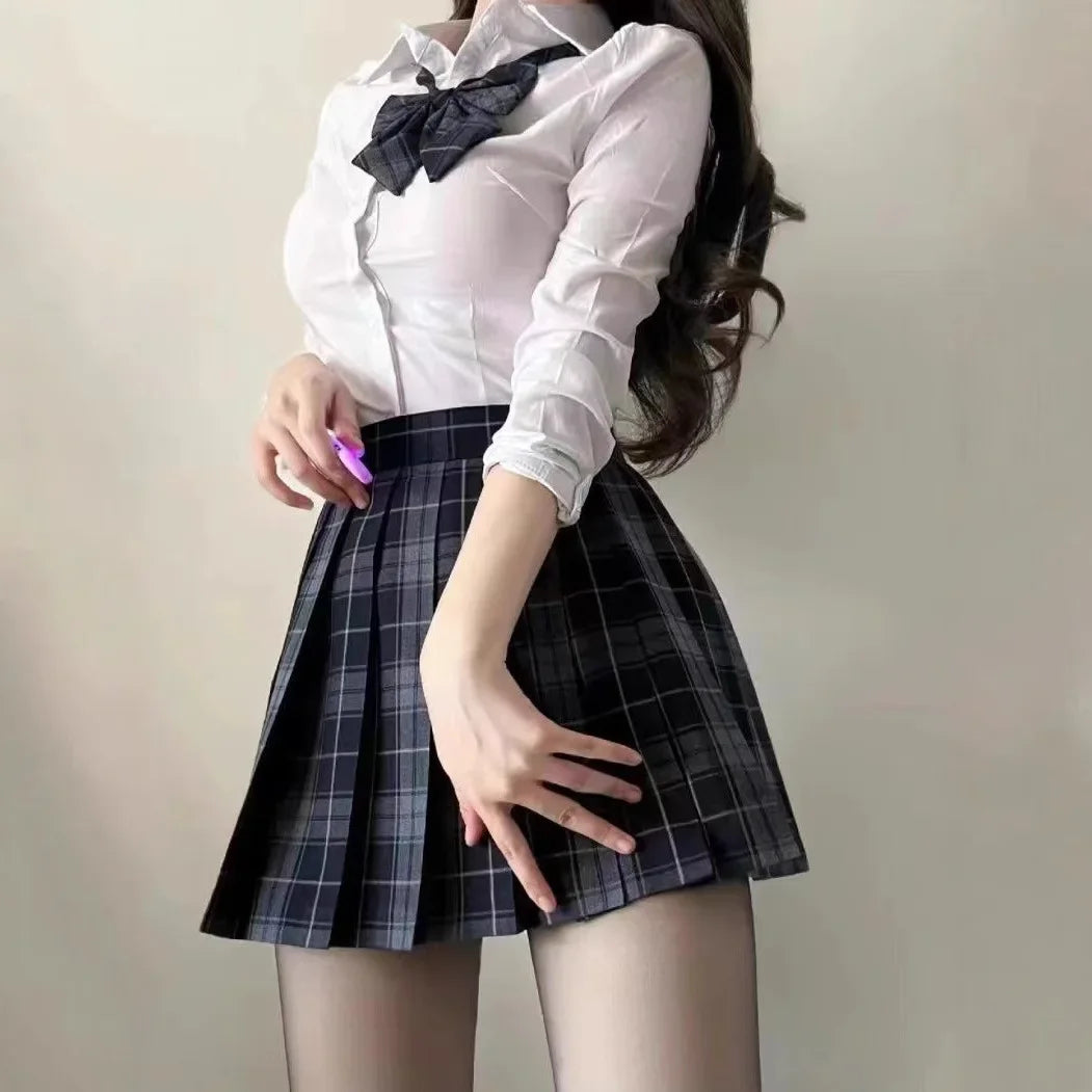 ?€? Versatile Clothing Set : This skirt set includes a plaid pleated skirt and a long short-sleeved shirt, providing versatility for various occasions and styles.