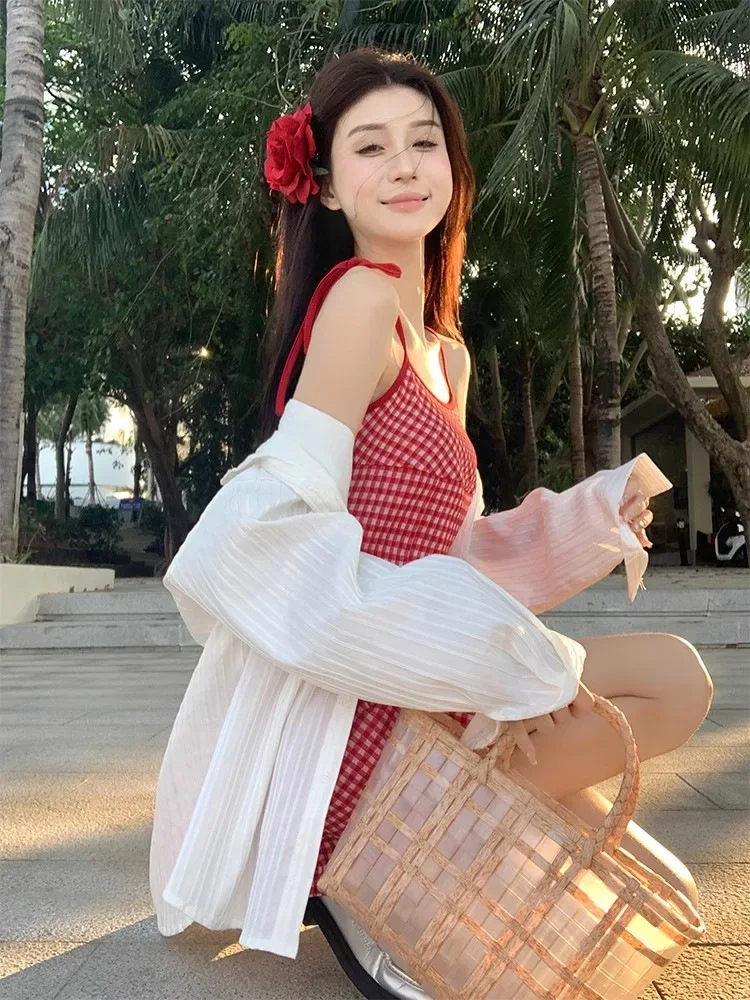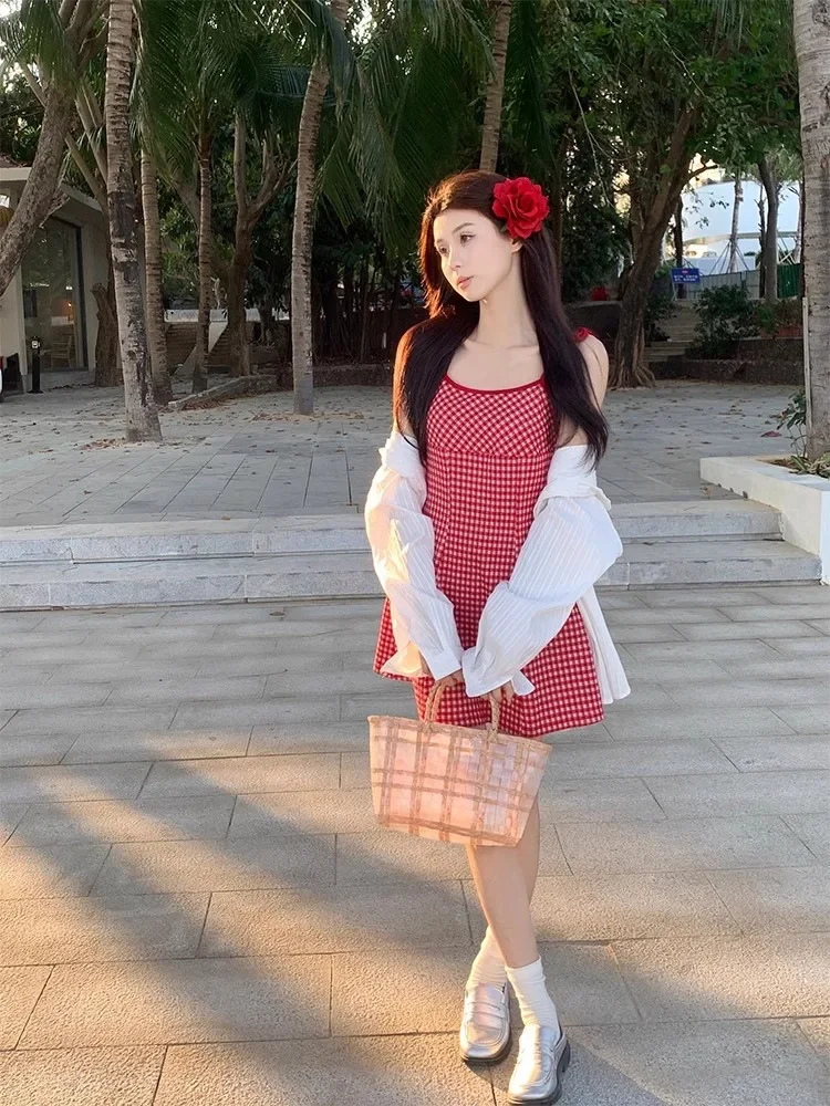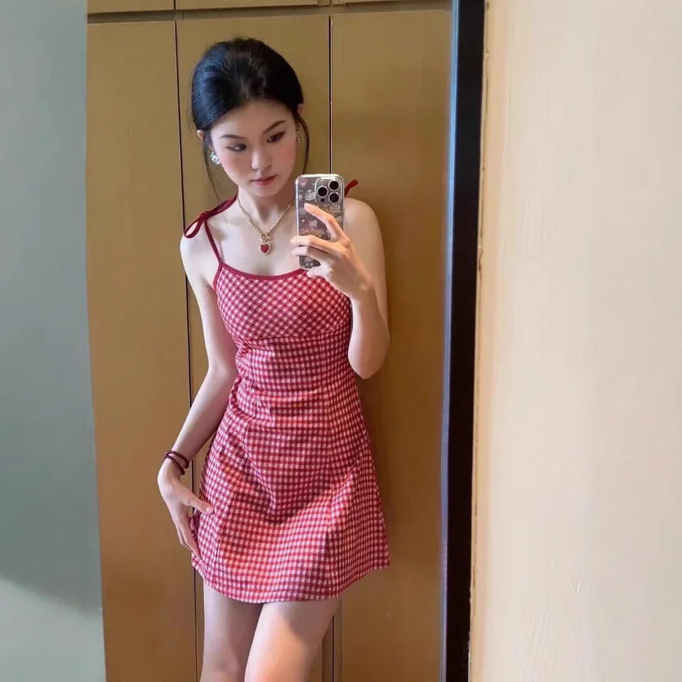 ?€? Summer-ready Design : This Simple Red Plaid Sling dress is perfect for summer, featuring a sleeveless design that keeps you cool during hot days.