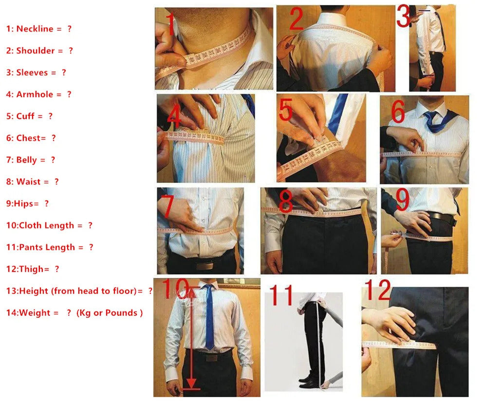 Please measure your body as shown in the following measurement chart, and send them to us.