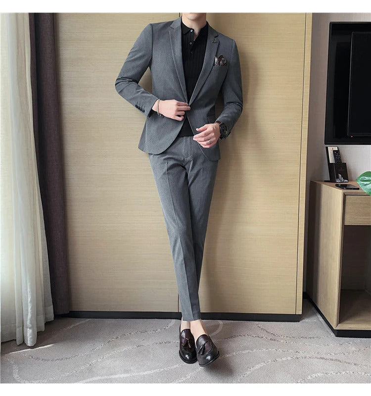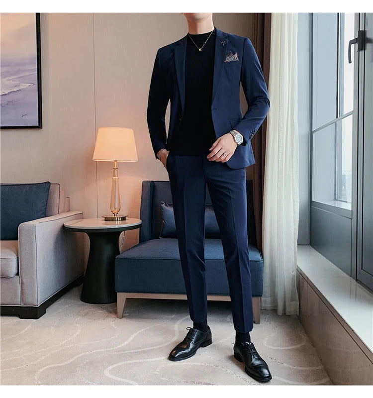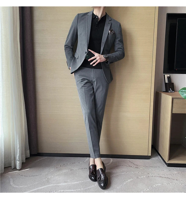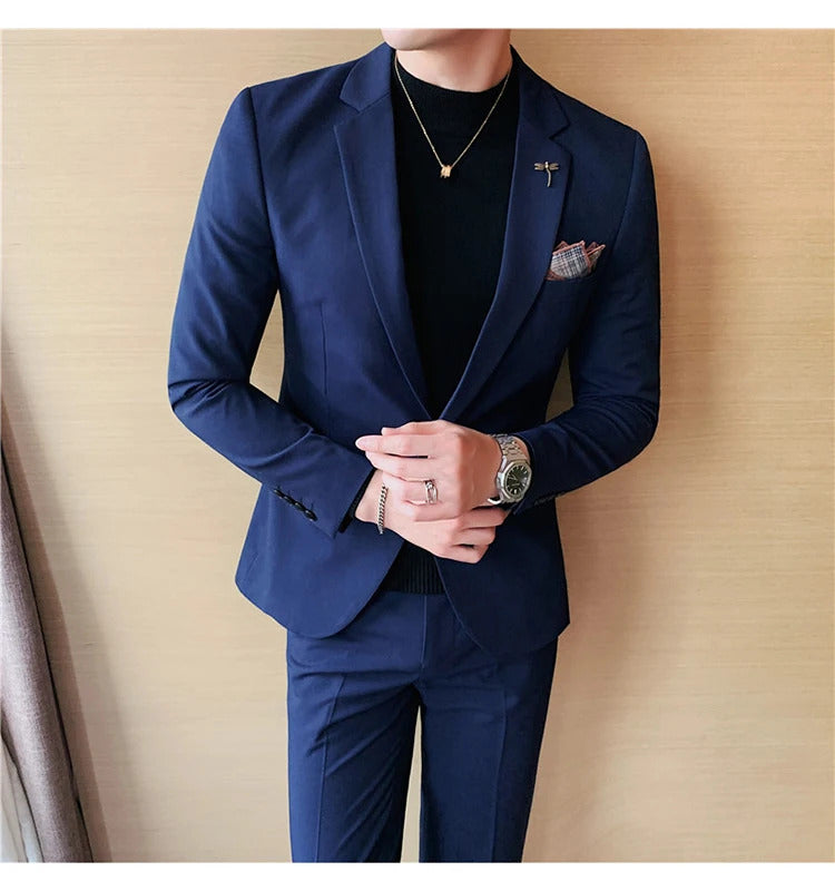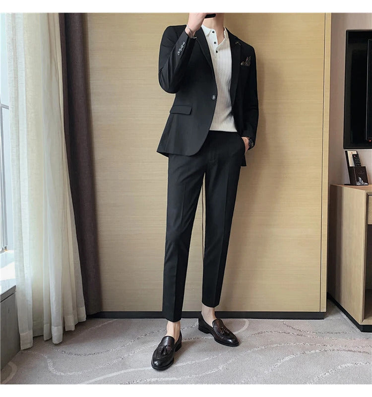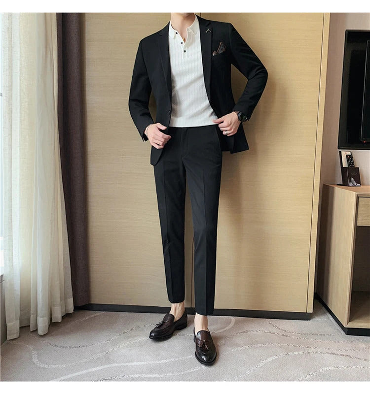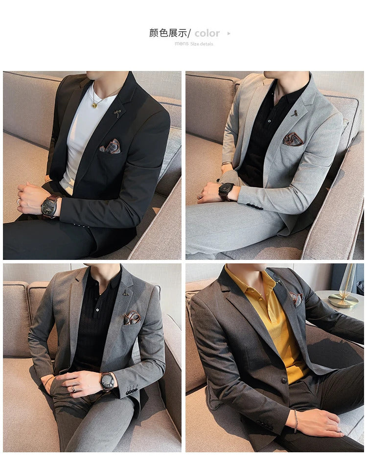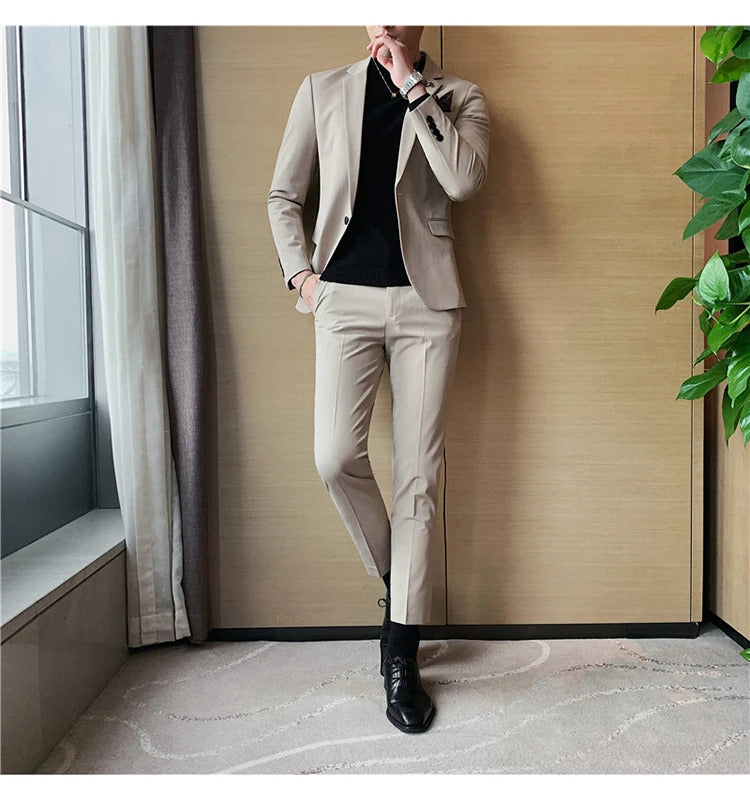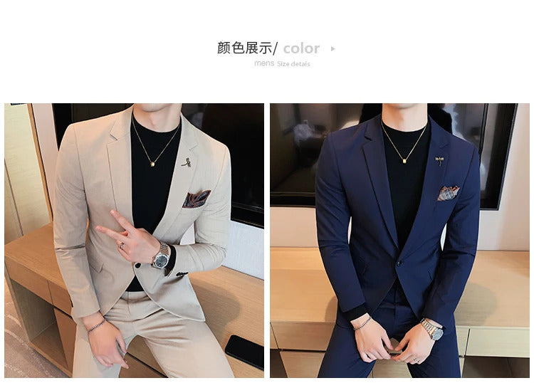 商务装男(Jacket+Pants) 2023 Suits Fashion New Men High Quality Low Price Business Wedding Groom Pure Color Blazers Trousers 2 Pcs Set