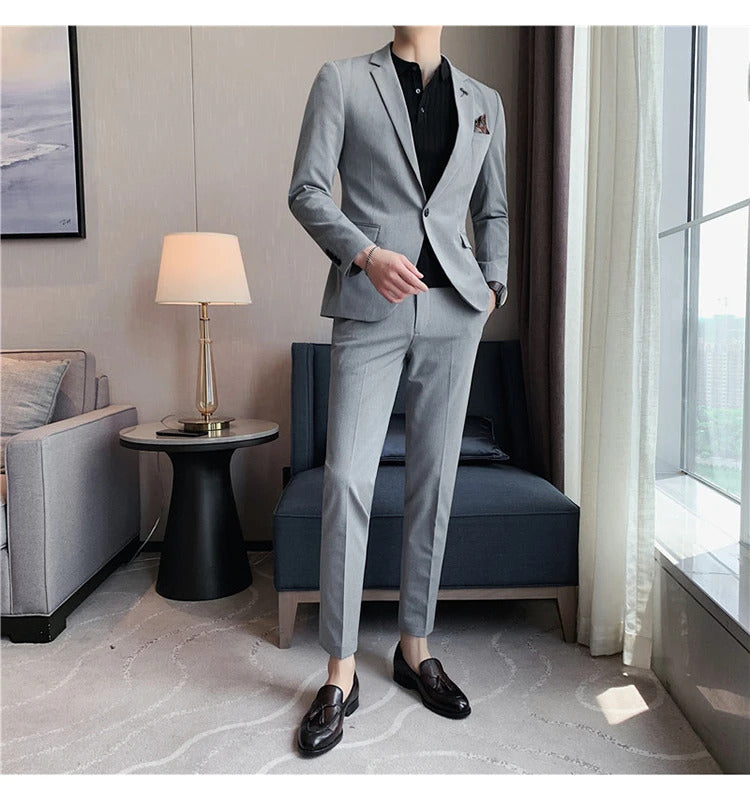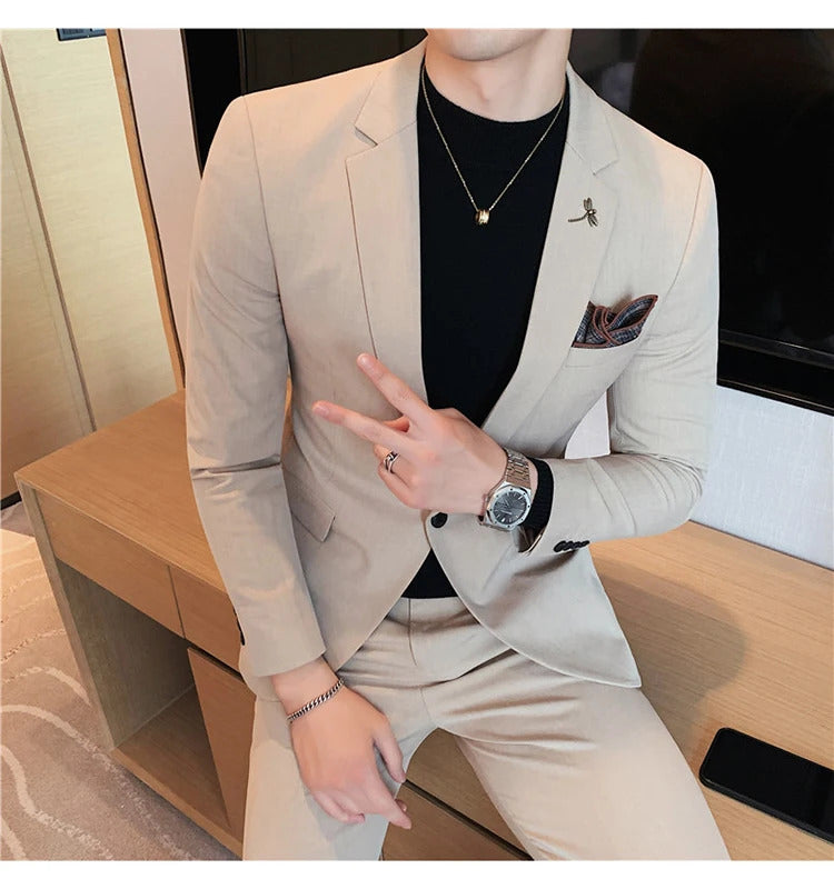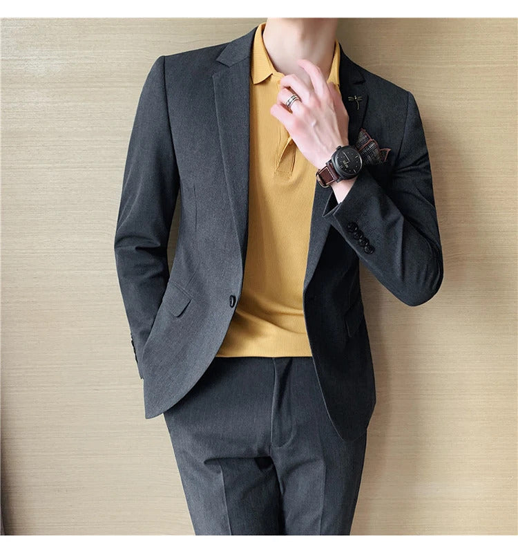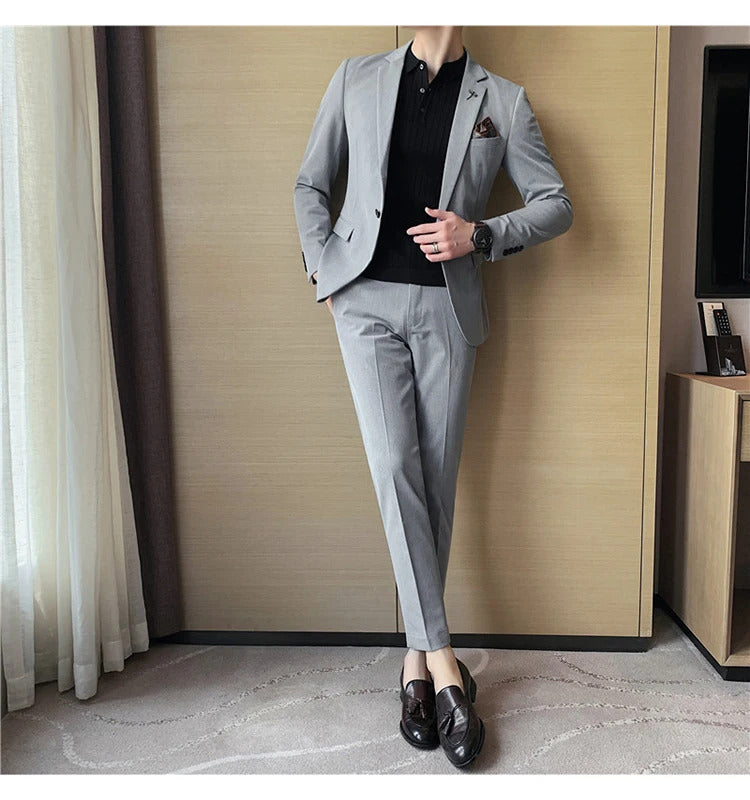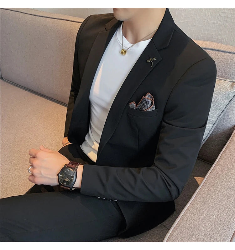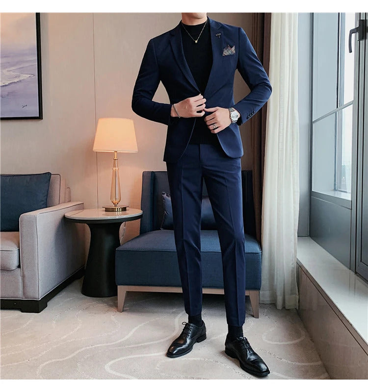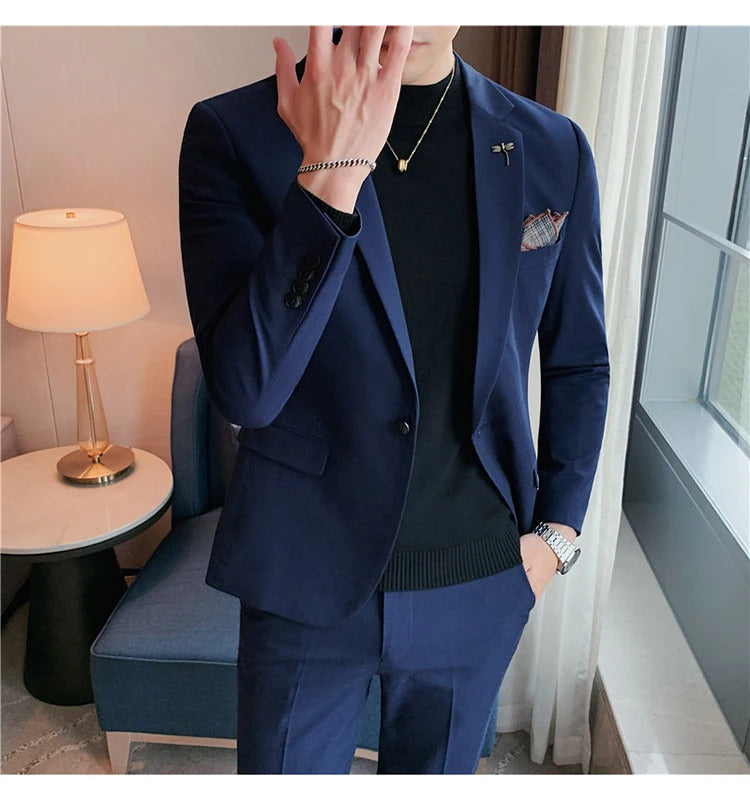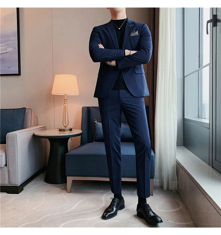 商务装男(Jacket+Pants) 2023 Suits Fashion New Men High Quality Low Price Business Wedding Groom Pure Color Blazers Trousers 2 Pcs Set