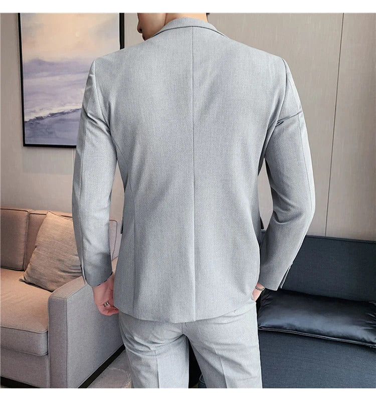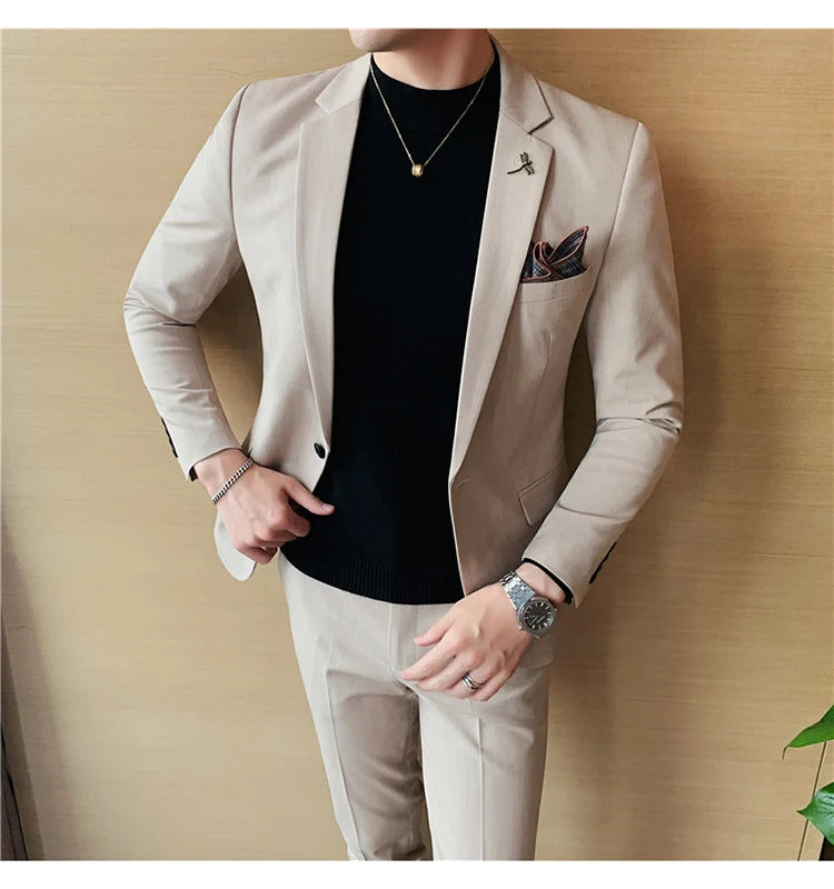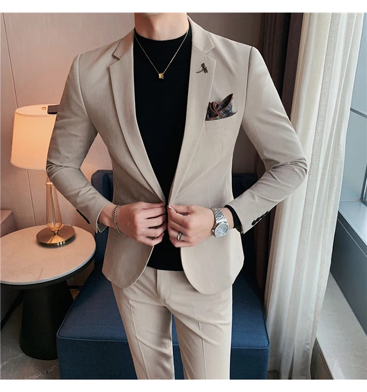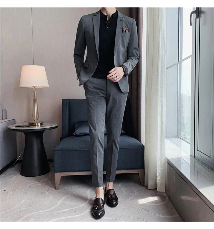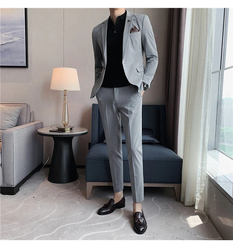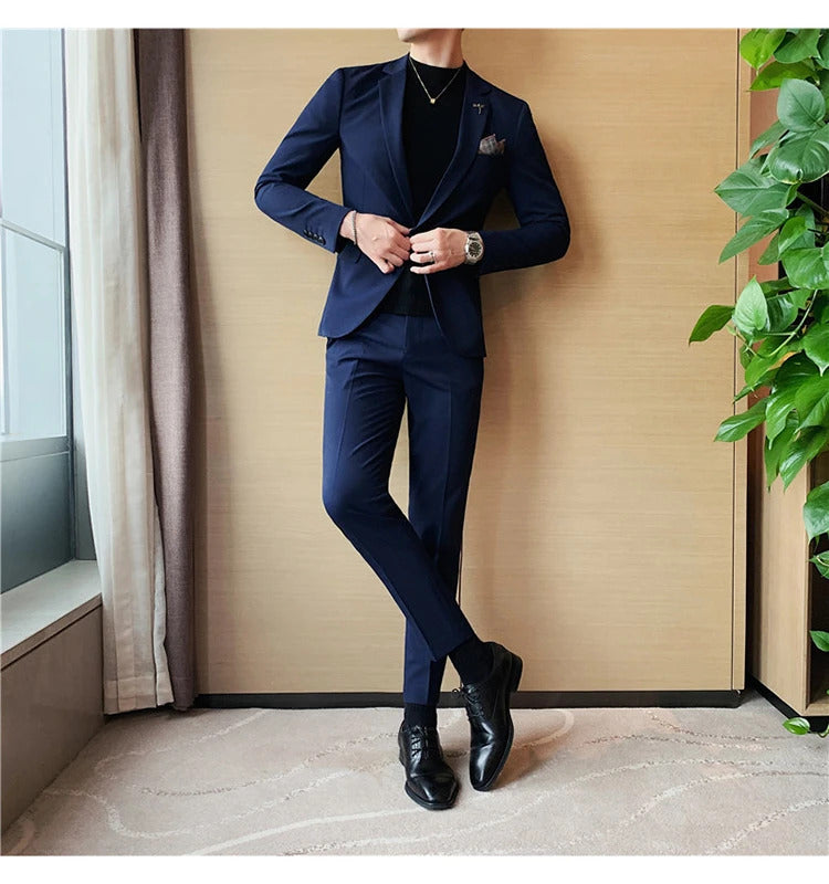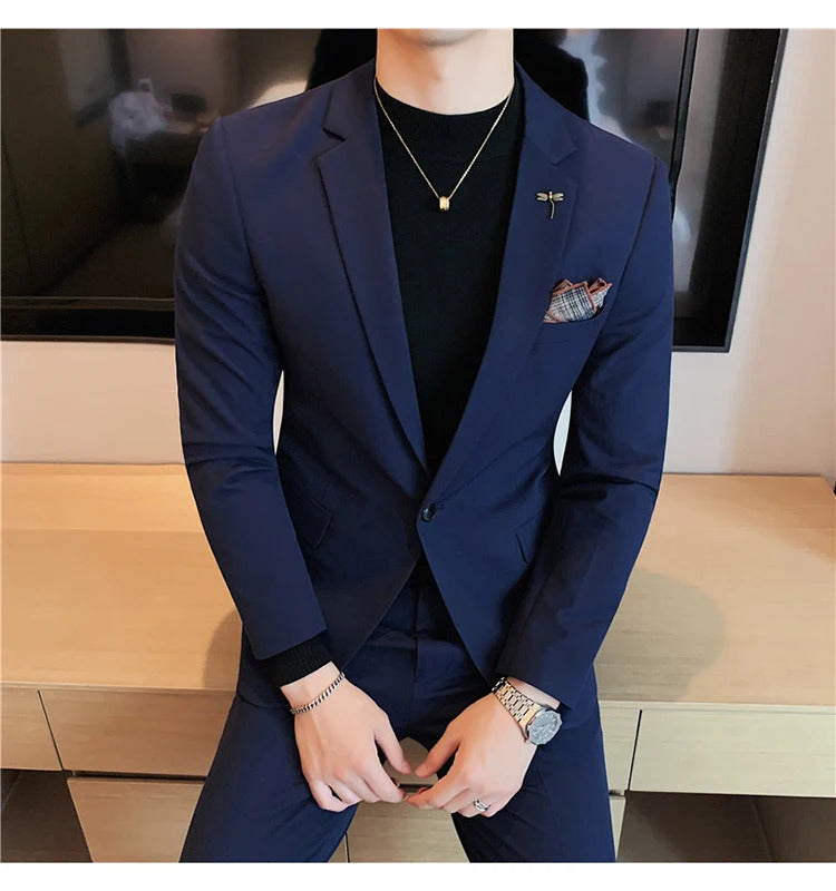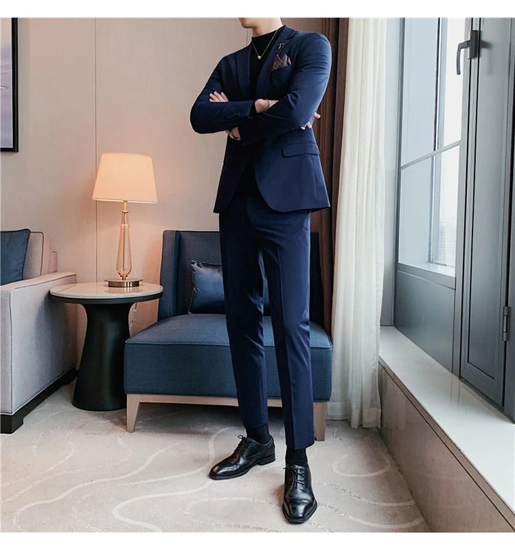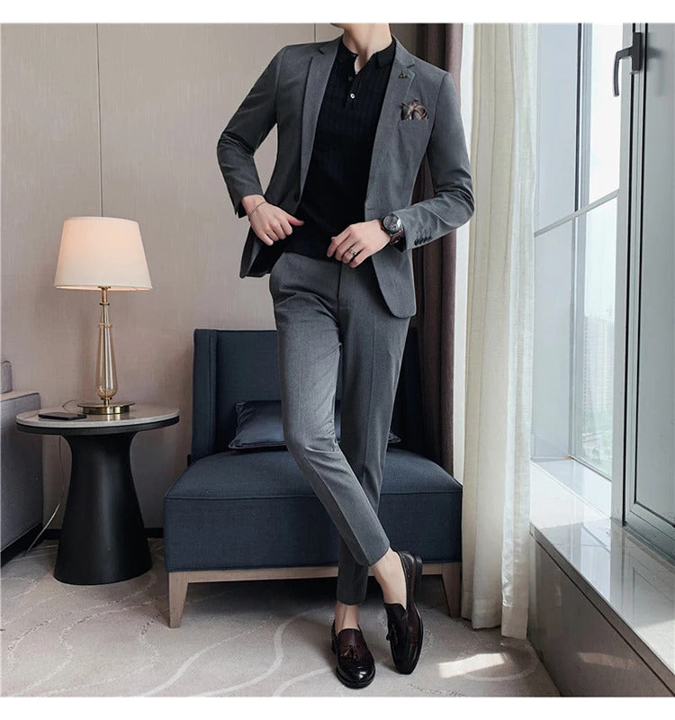 商务装男(Jacket+Pants) 2023 Suits Fashion New Men High Quality Low Price Business Wedding Groom Pure Color Blazers Trousers 2 Pcs Set