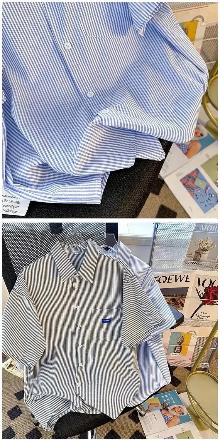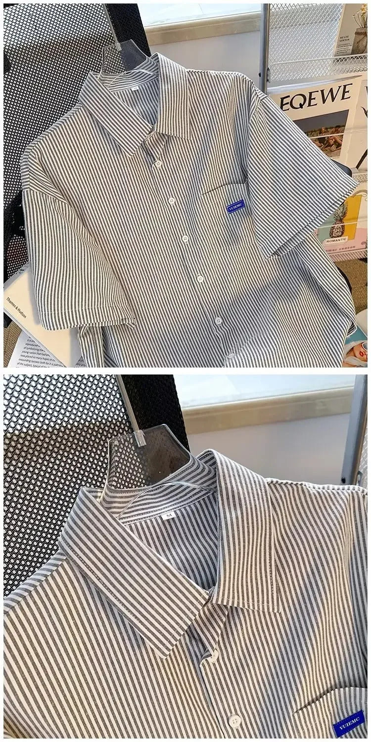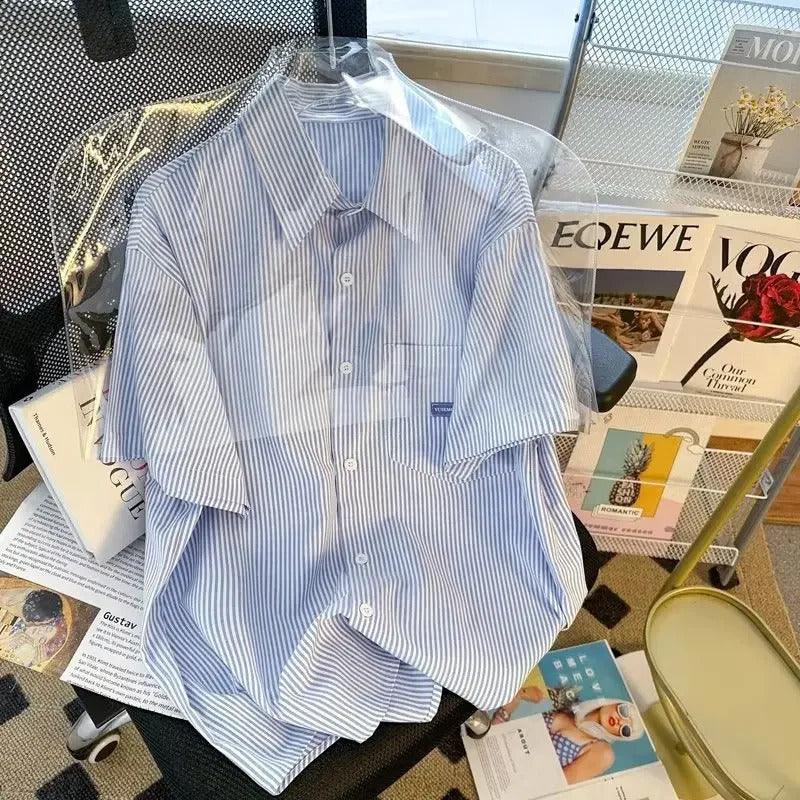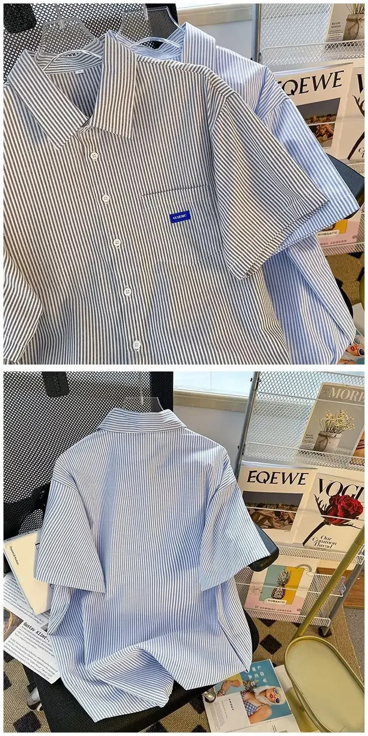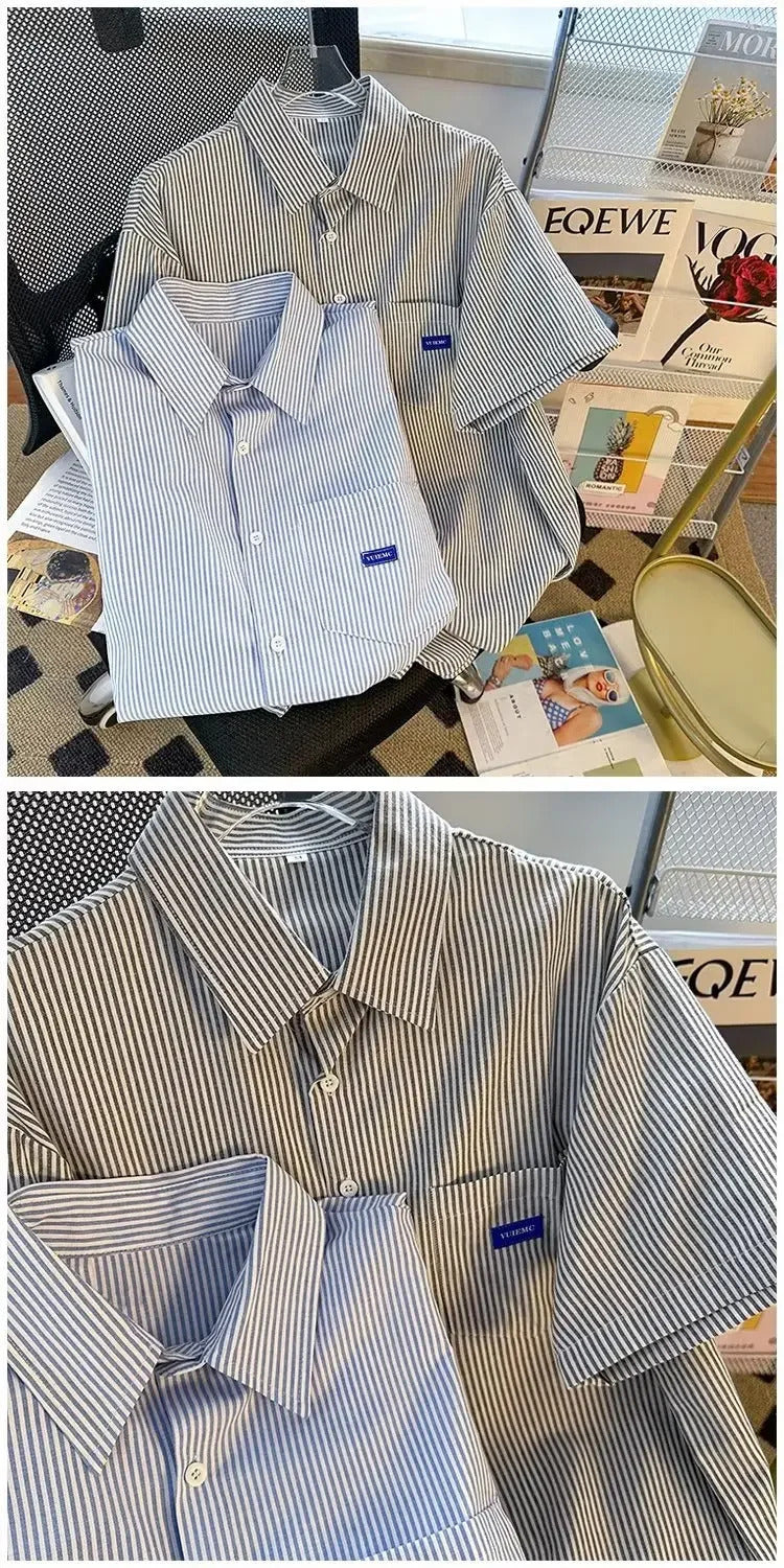 衬衫男Japanese Style Fresh Striped Short Sleeve Shirt Men's Summer Thin Loose-Fit Cardigan Outerwear Casual Scene Nonspecific Material