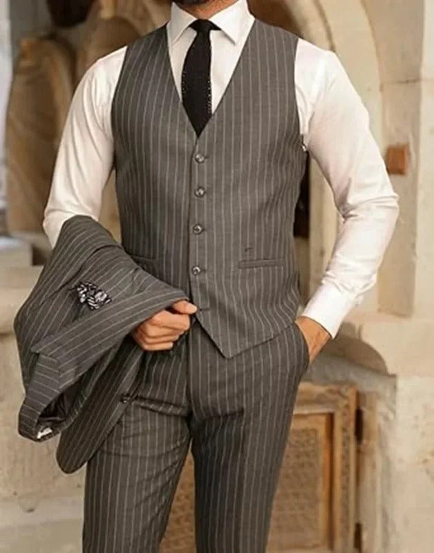礼服男Men's Classic Formal Pinstripe Tuxedos Suits 3 Pieces Slim Fit Blazer Peak Lapel Two Button Groomsmen Wedding Dress Business