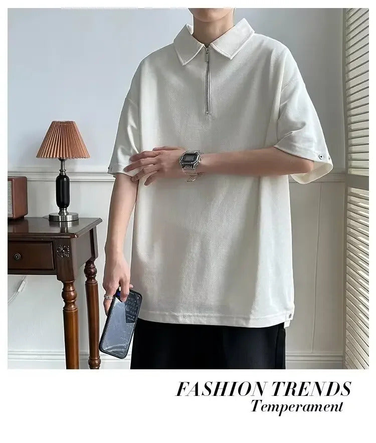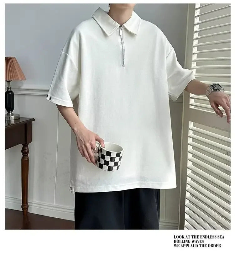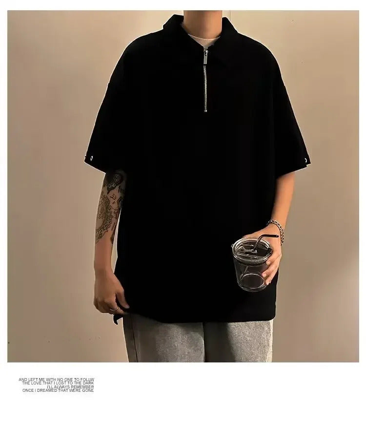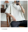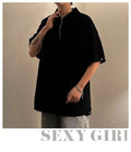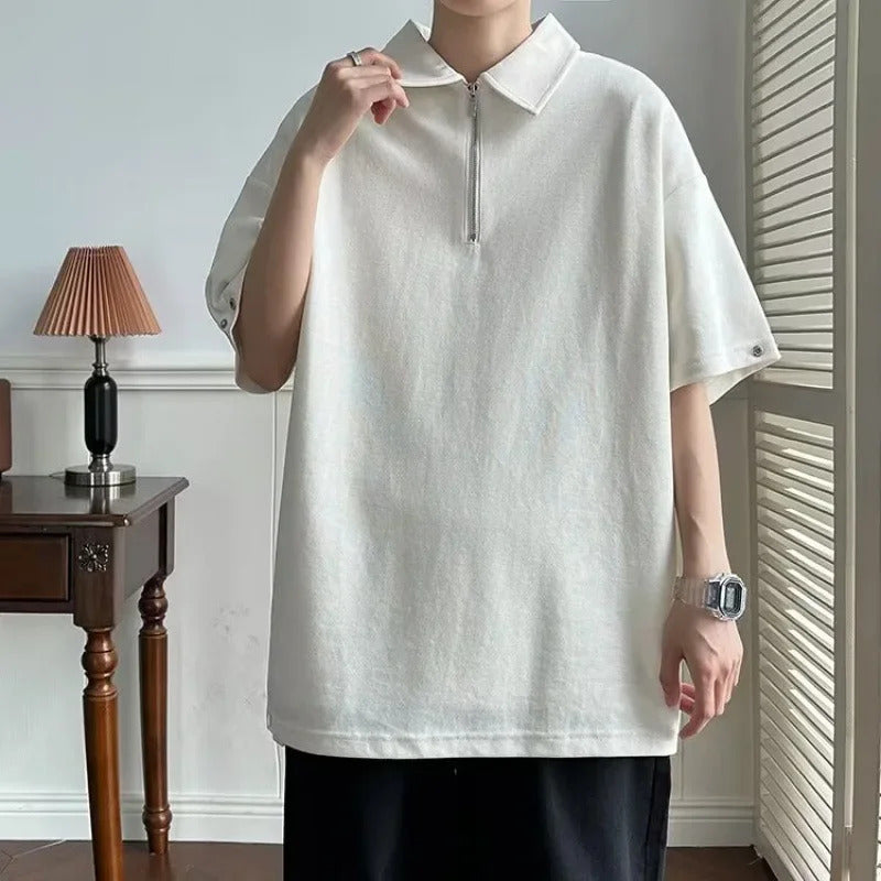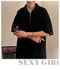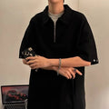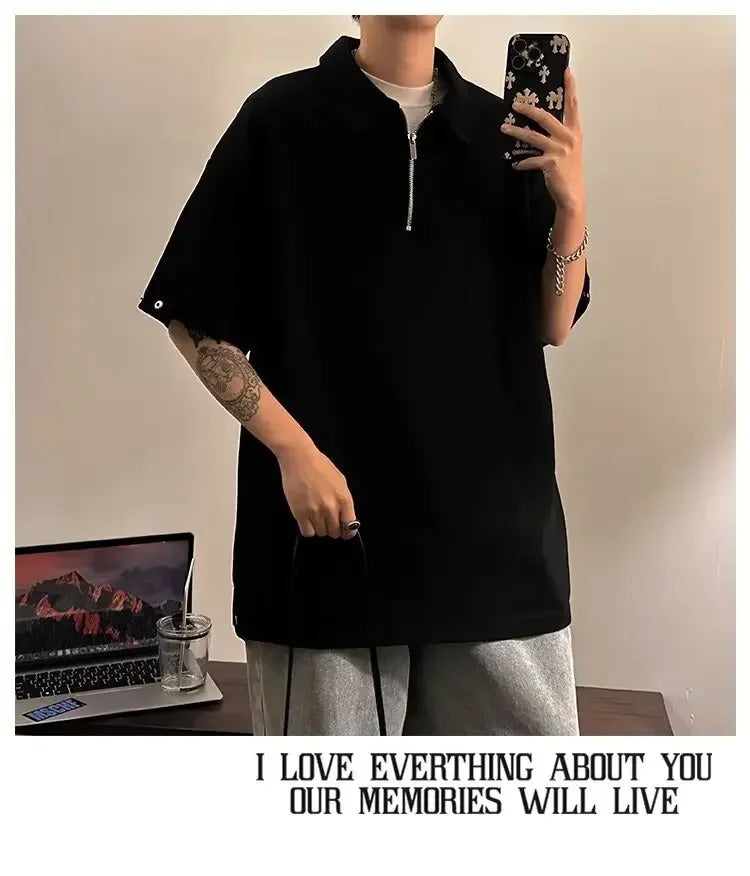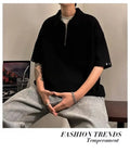 POLO男Solid Color Half-Zip Polo Shirt Men's Casual Loose Fit Hip Hop Trendy Fashion Short Sleeve T-Shirt Base Layer Lapel Five Point T