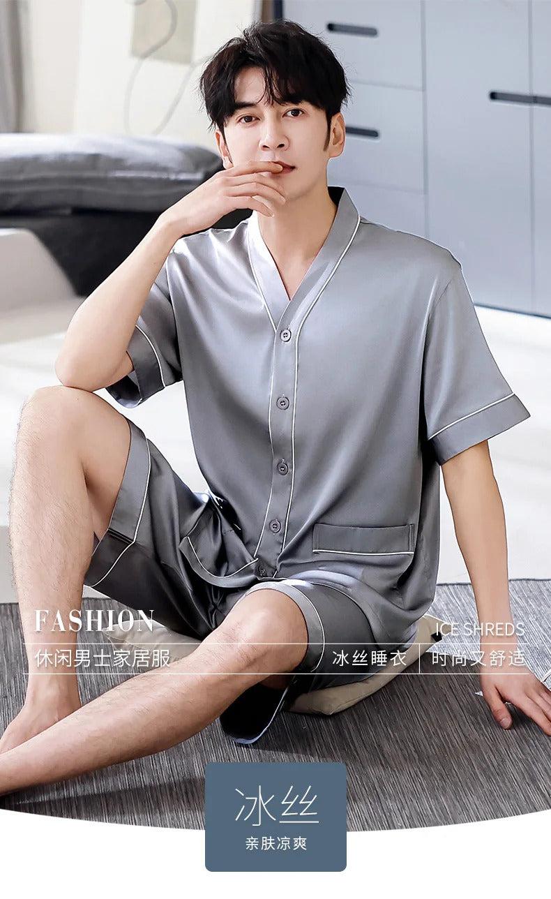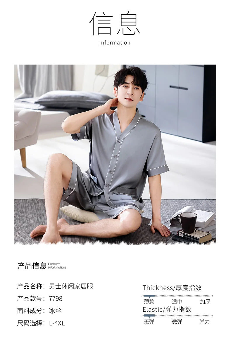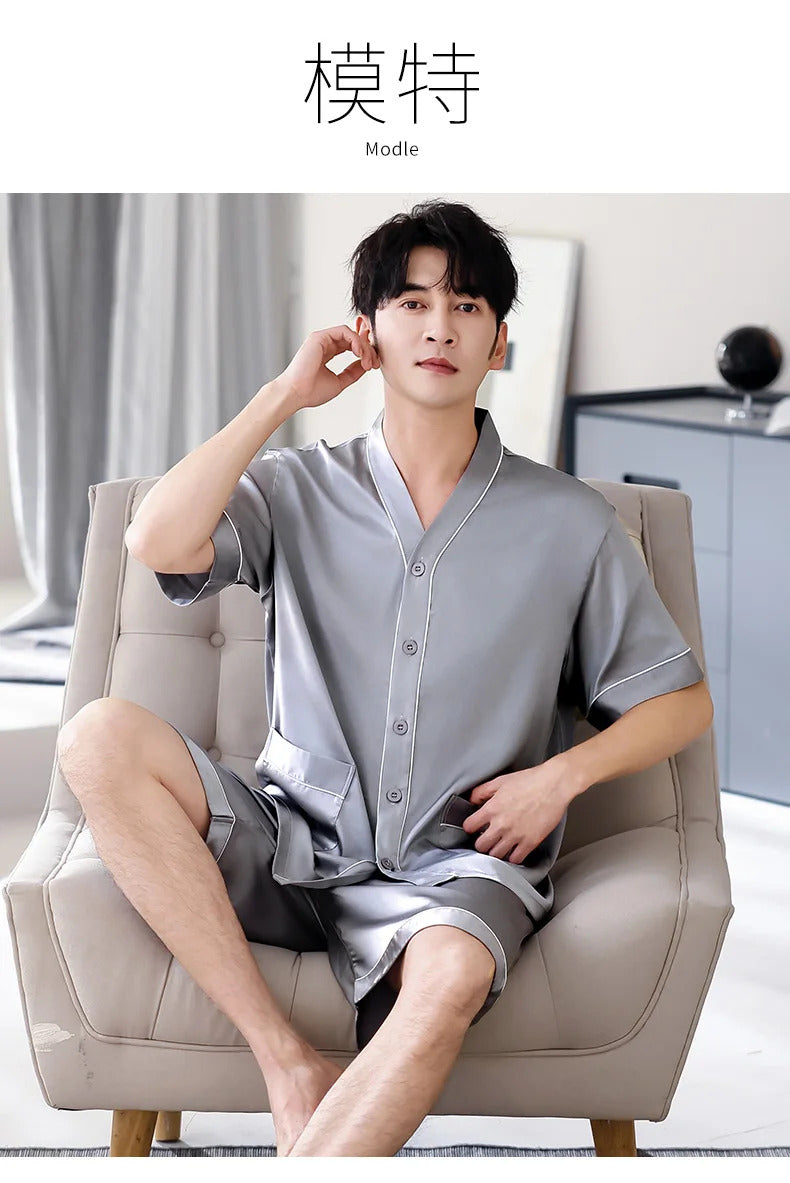 睡衣男Summer L-4XL Silver Kimono Pyjamas Faux Silk Men's Pajama Sets Satin Pajama Male Sleepwear Pajamas Nightwear Homewear Fashion