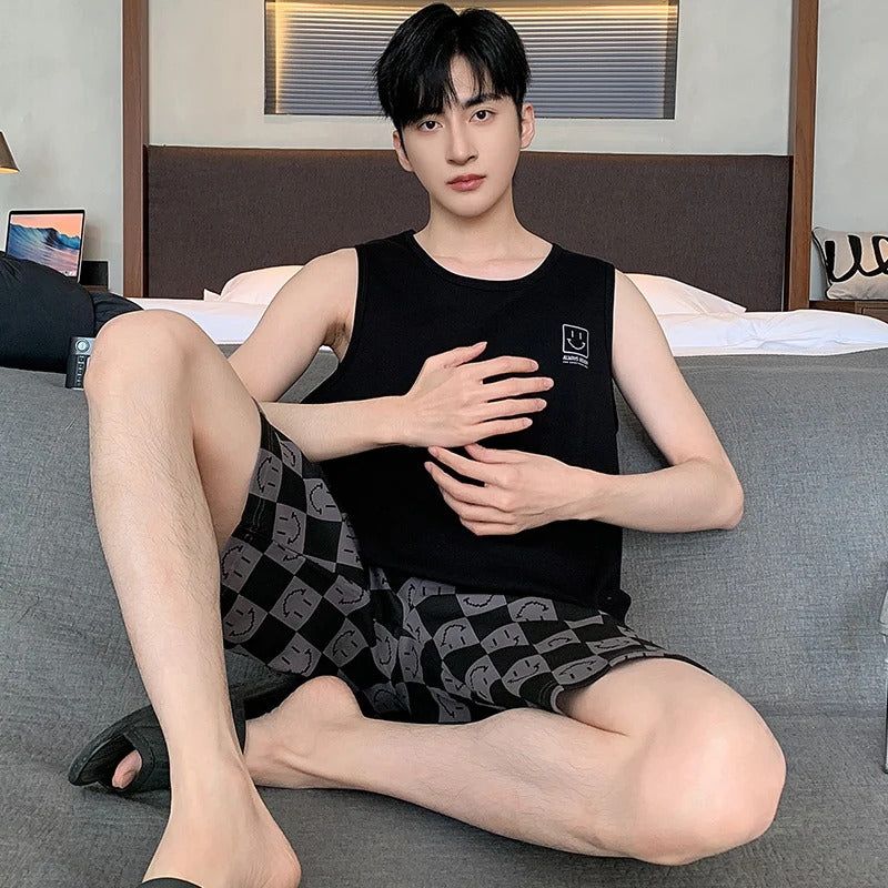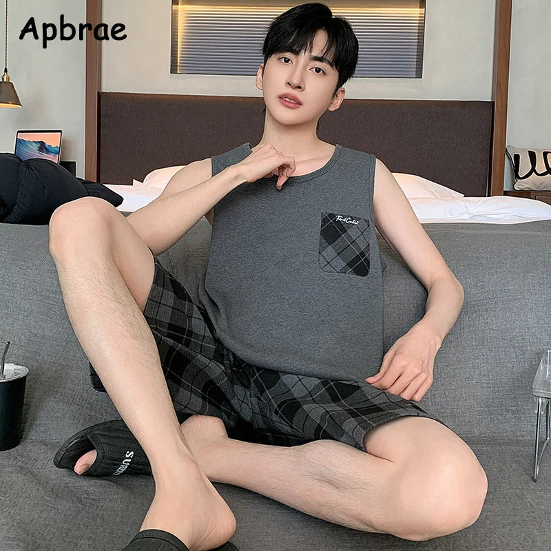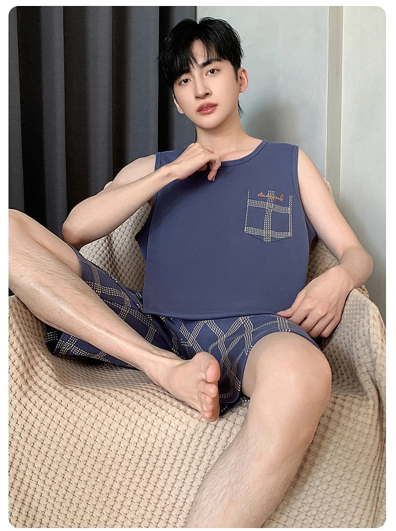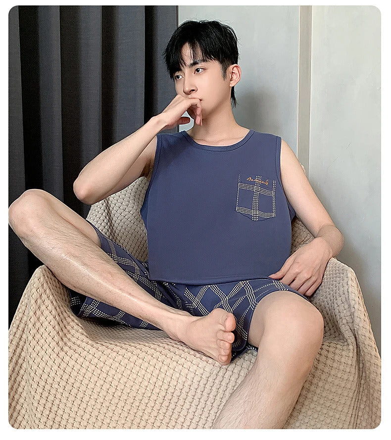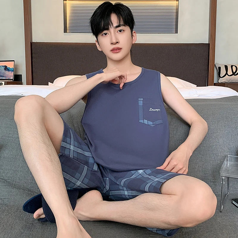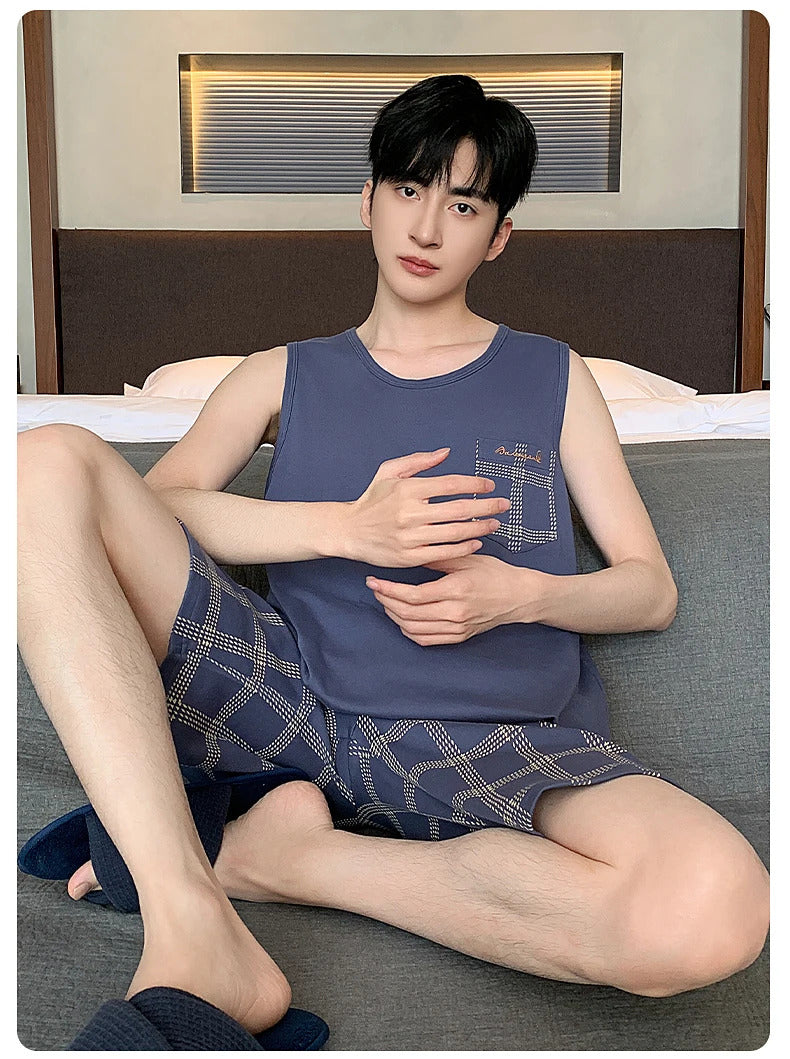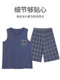Summer Sleeveless Two Piece Set Men Pajamas Summer Soft Cotton Pajama Sets for Man Plaid Pants Pjs Fashion Man Sleepwear