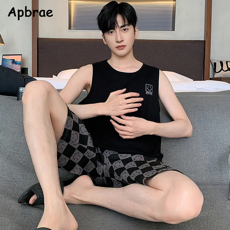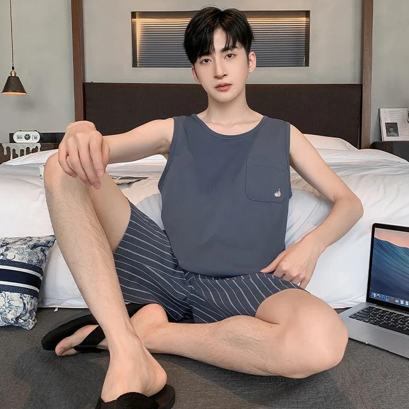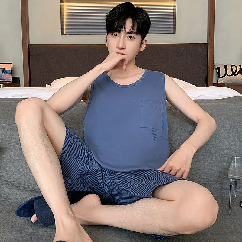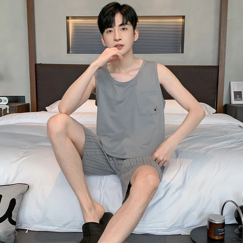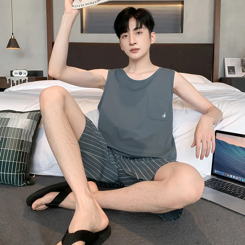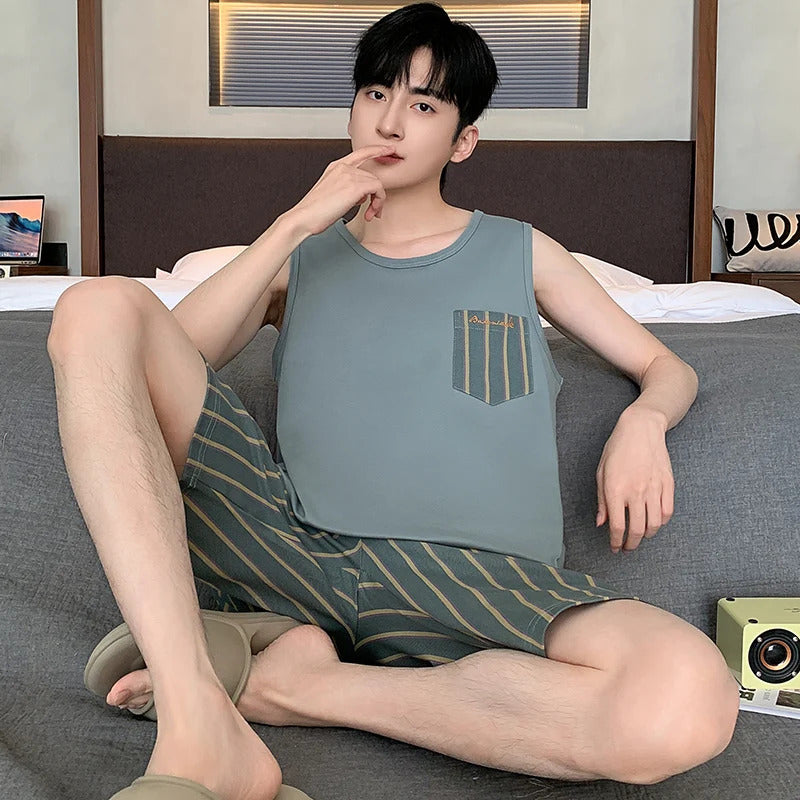 Summer Sleeveless Two Piece Set Men Pajamas Summer Soft Cotton Pajama Sets for Man Plaid Pants Pjs Fashion Man Sleepwear