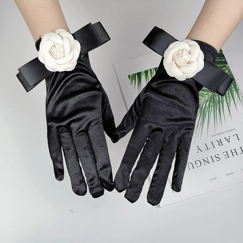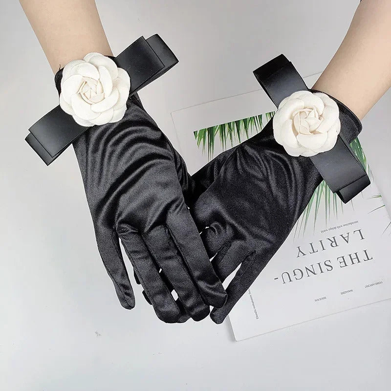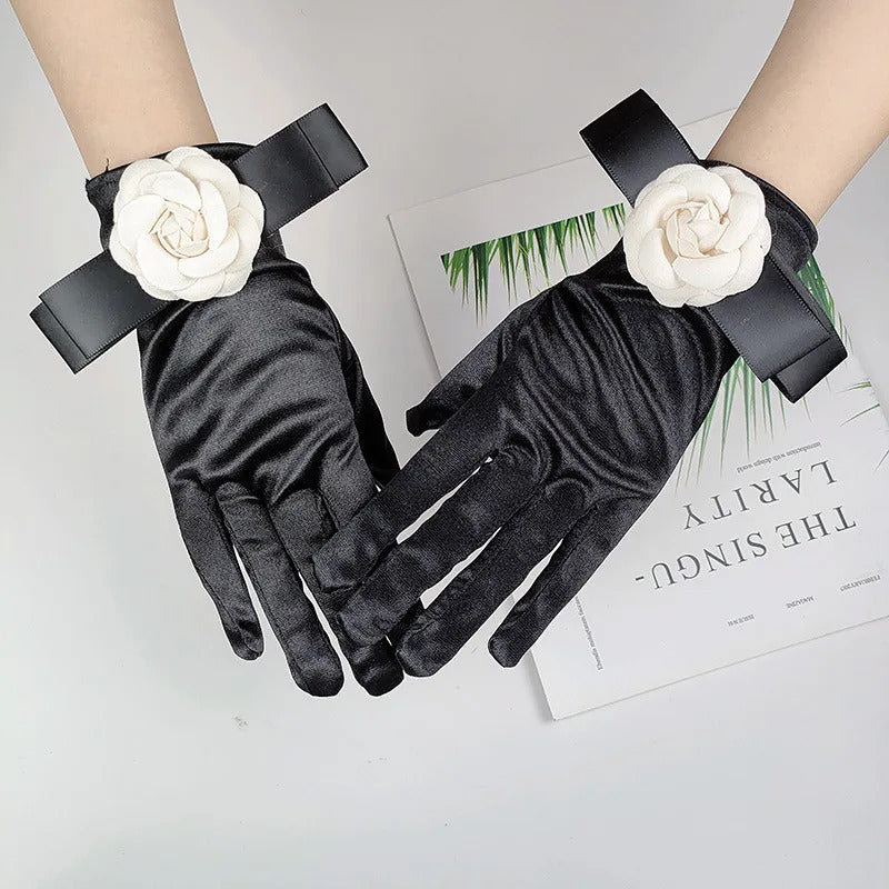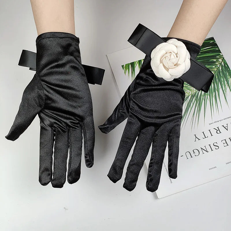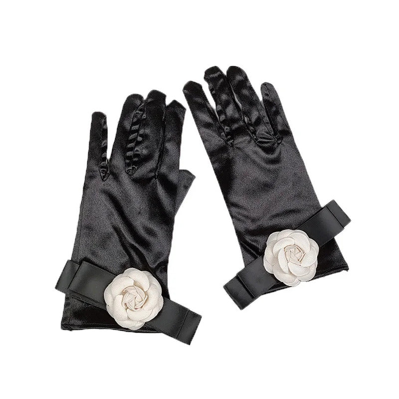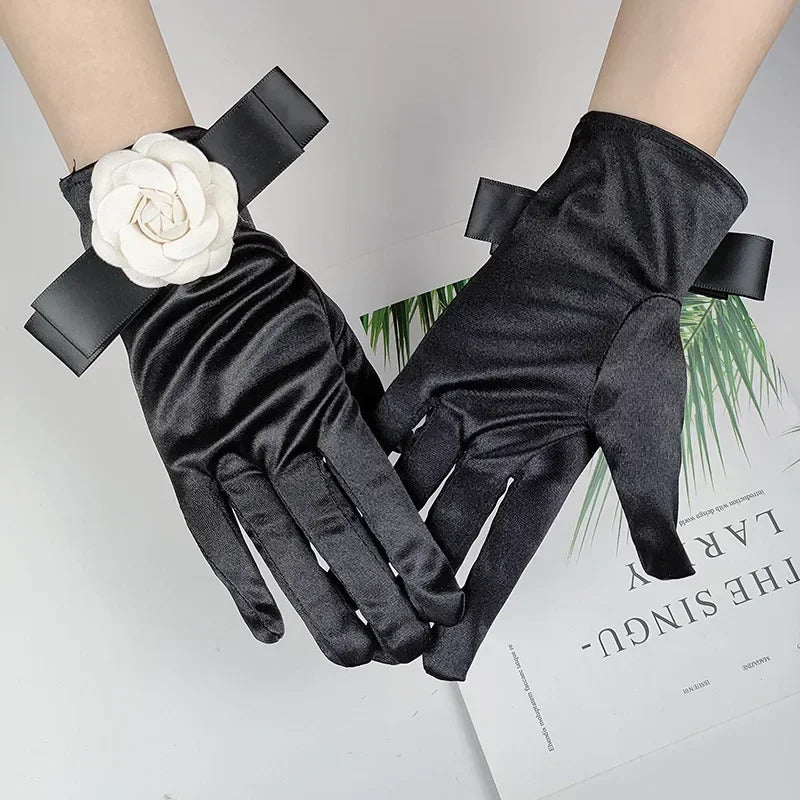 防晒手套女Women Wedding Dress Etiquette Performance Short Elastic Spandex Glove Bride Bow Camellia Flower Dance Party Professional Mitten