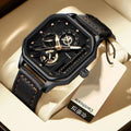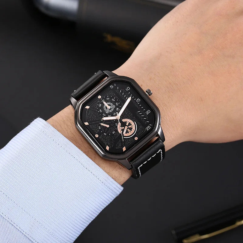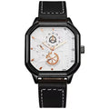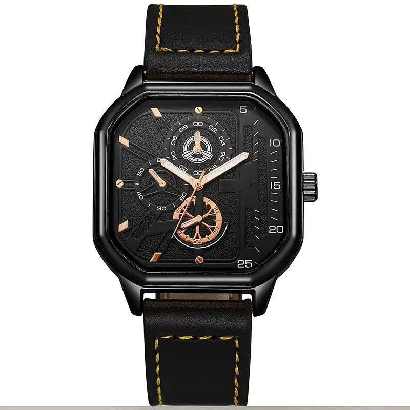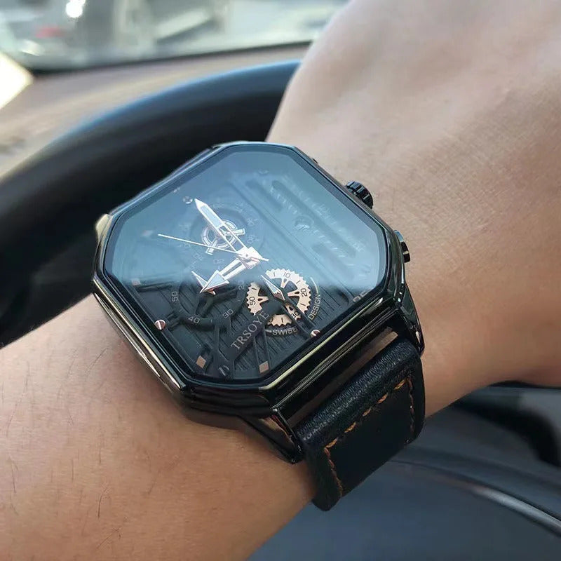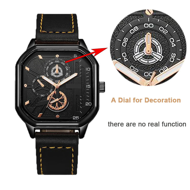 YIKAZE Alloy Men Quartz Watches Leather Strap Big Dial Student Square Sports Watch Cool Black Men's Watch Waterproof Wristwatch Clock